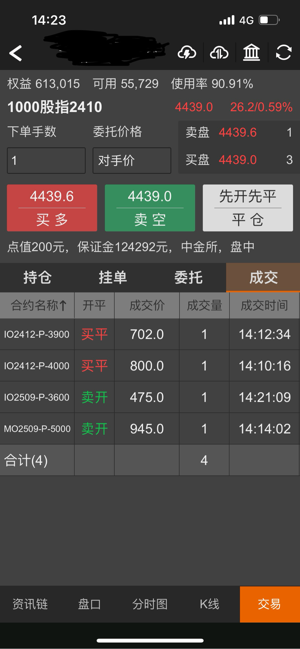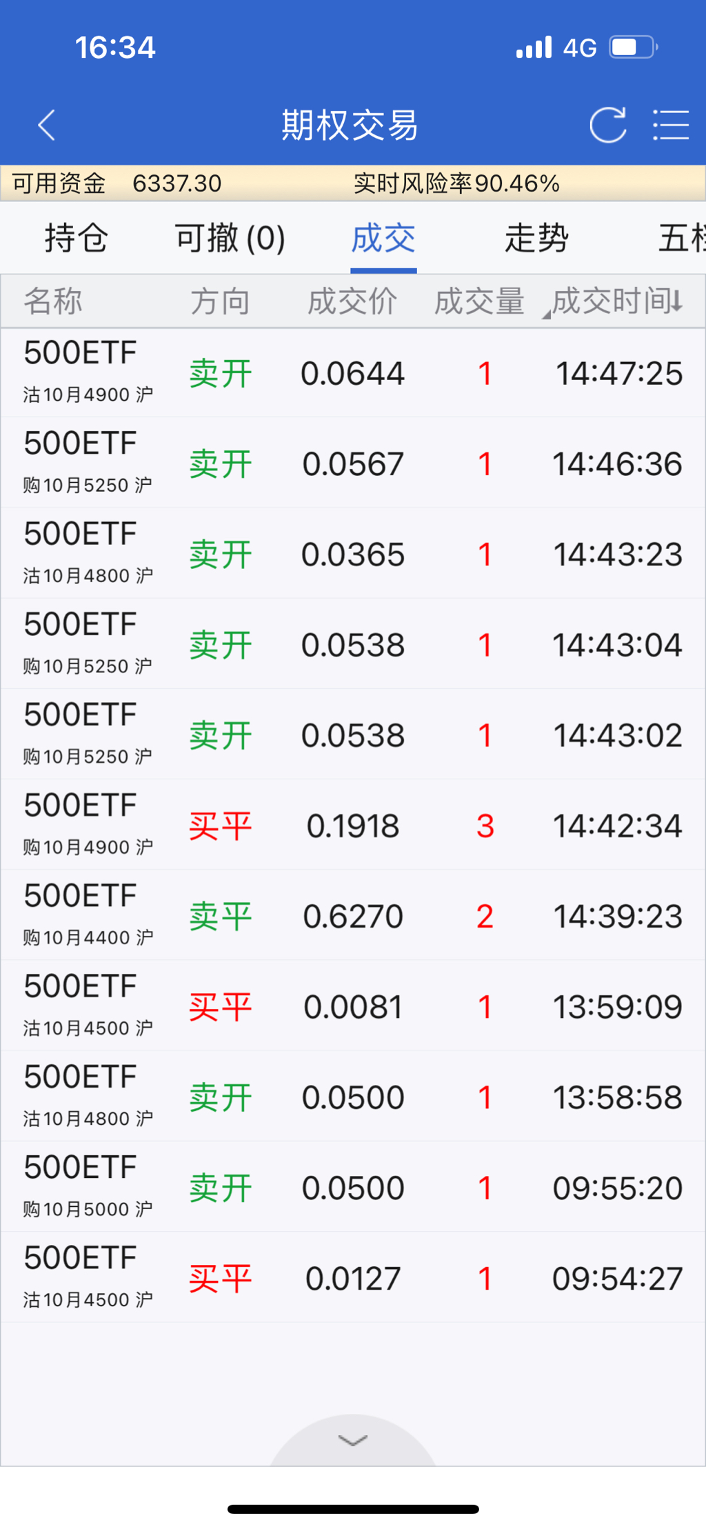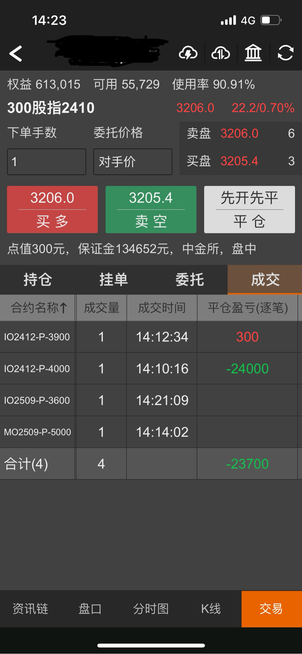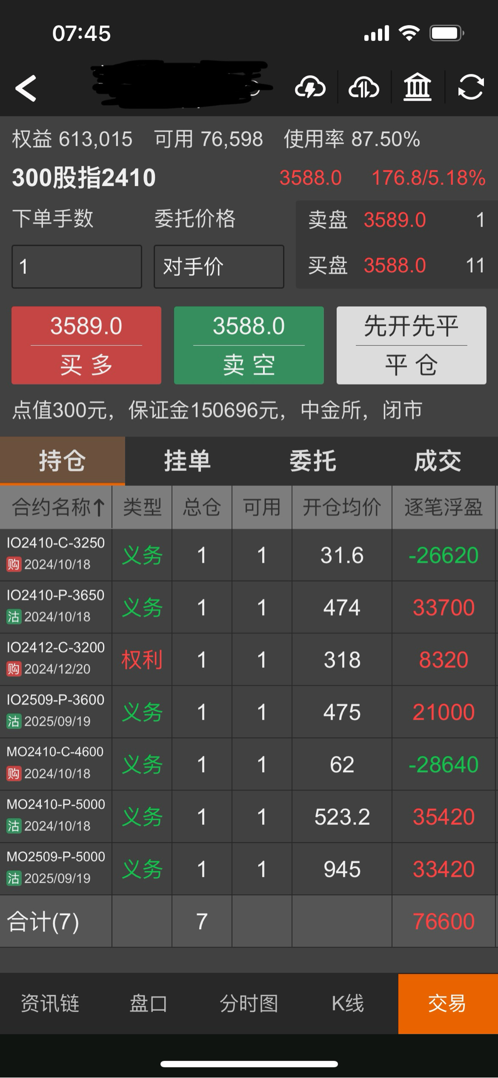 2509合约可以开仓了,今天IO反弹多一点,直接把两张多头底仓IO卖沽换到2509,IO只能开3600,换一张IO到MO,最多能开MO5000卖沽。