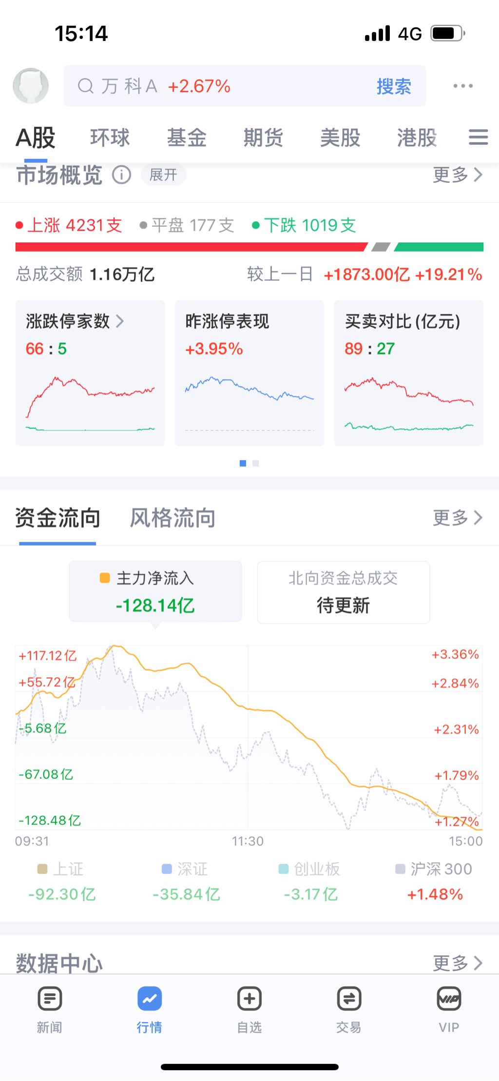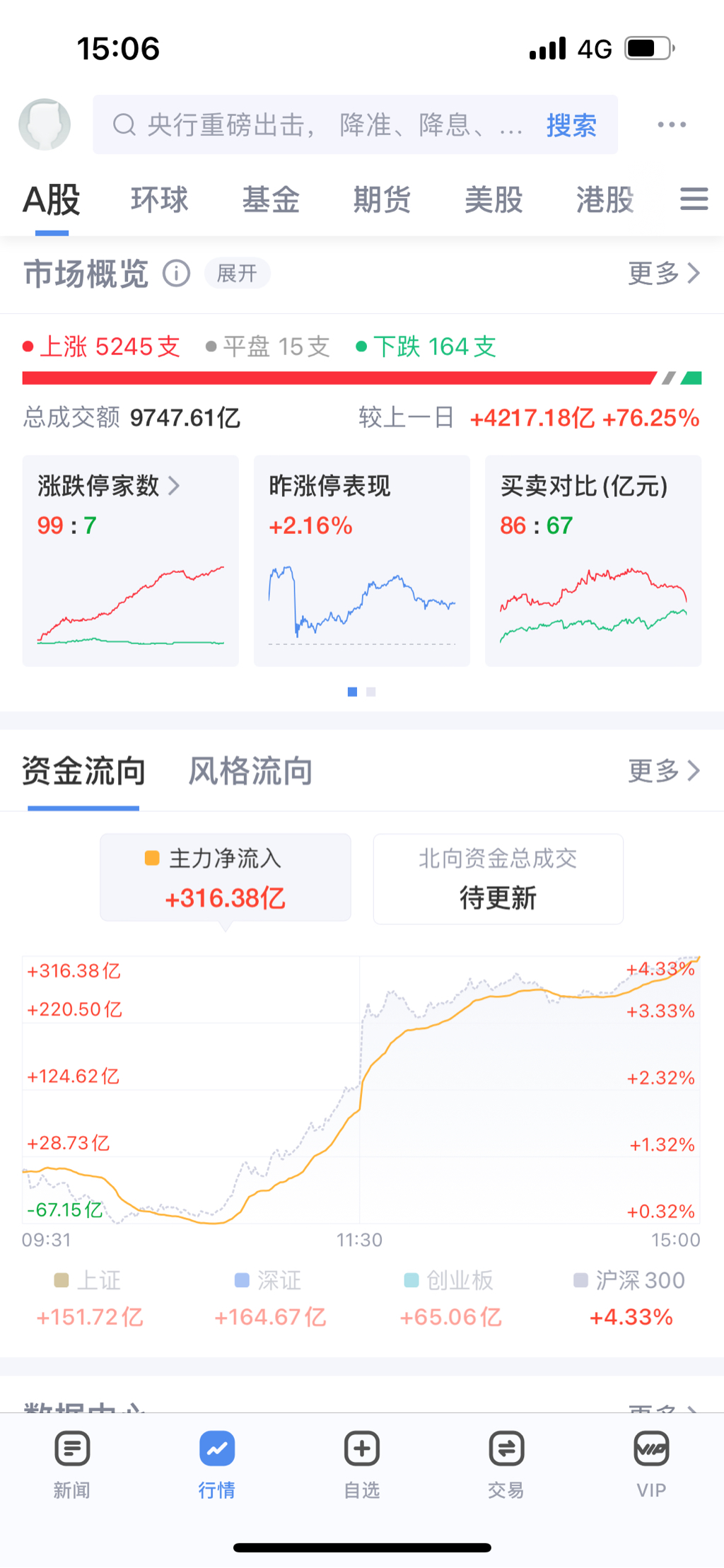 老师,这个图片图是是什么软件APP呀?这个是新浪财经的A股市场概览和资金流向,看涨跌家数和成交金额,还有主力资金流向。北向资金现在没有数据了。一般高开主力资金流入,转流出的时候开卖购比较合适,下杀的时候看主力资金转流入了就可以考虑加仓。今天这个资金就是在潘哥回答提问的时候放出了5000亿然后资金就从流出转流入了,到下午放量到接近万亿都没有流出的意思,主力大举进入就不适合加卖购,要考虑逼空的问题了。