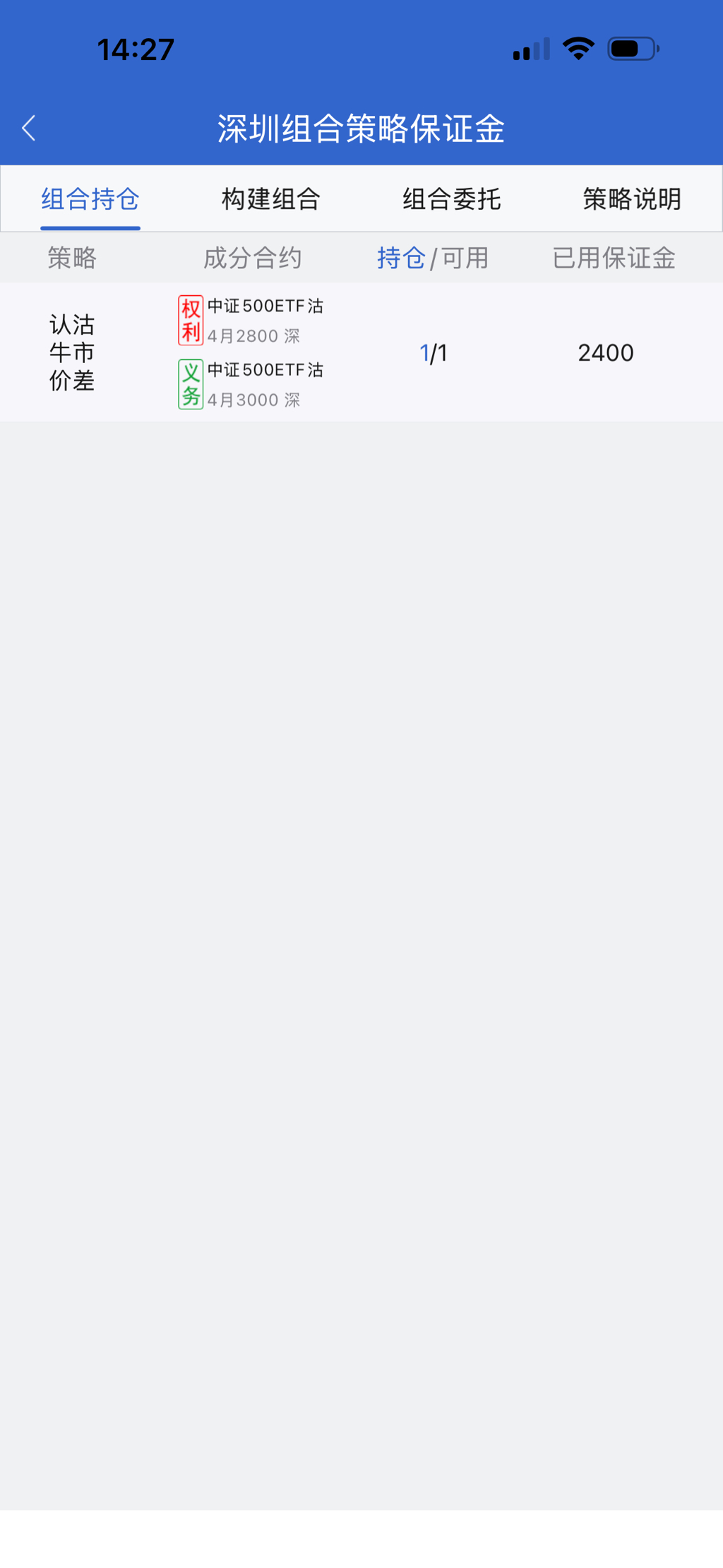 卖沽加买沽也可以使用组合保证金,今天反弹了构建一组卖沽3000买沽2800的组合,占用保证金2400元。可以看到比直接卖沽占用的保证金少很多。