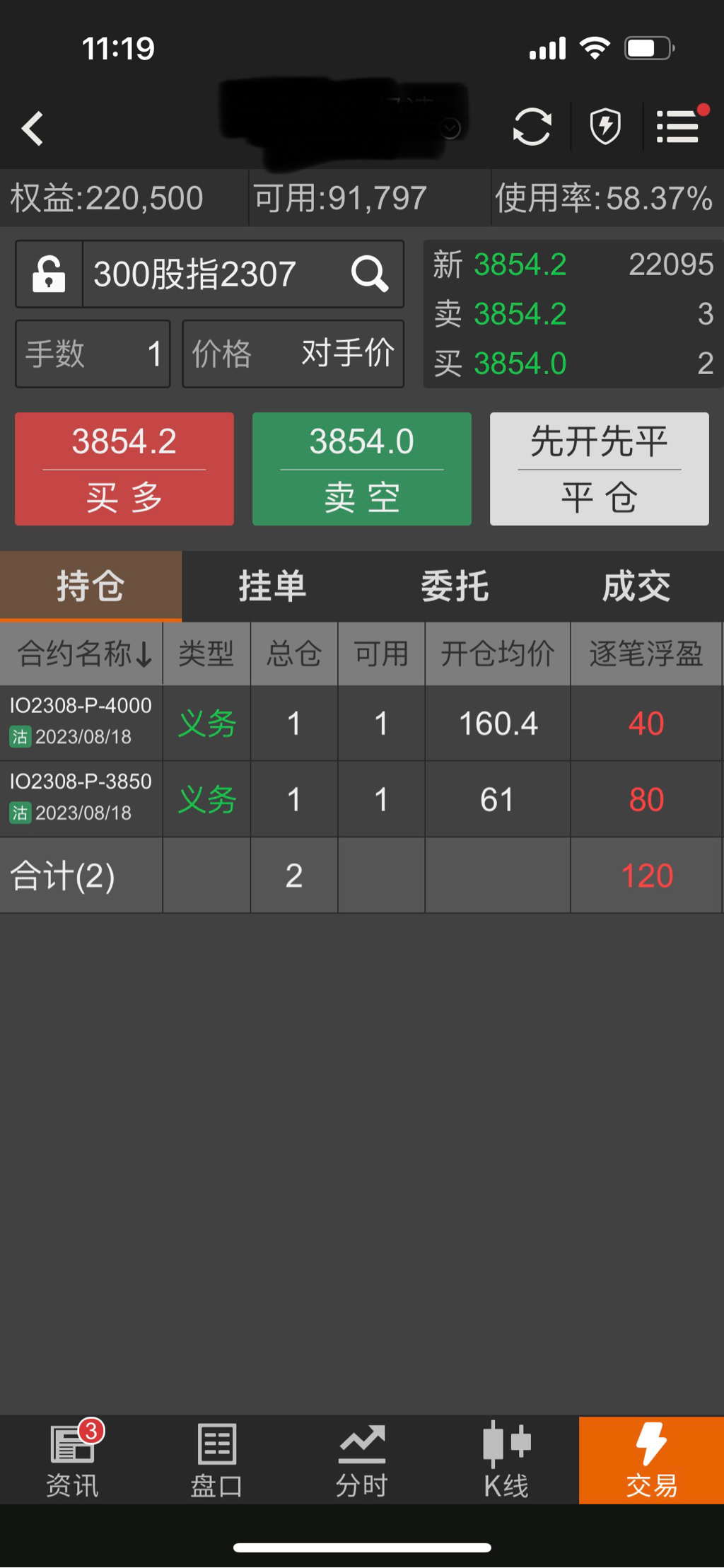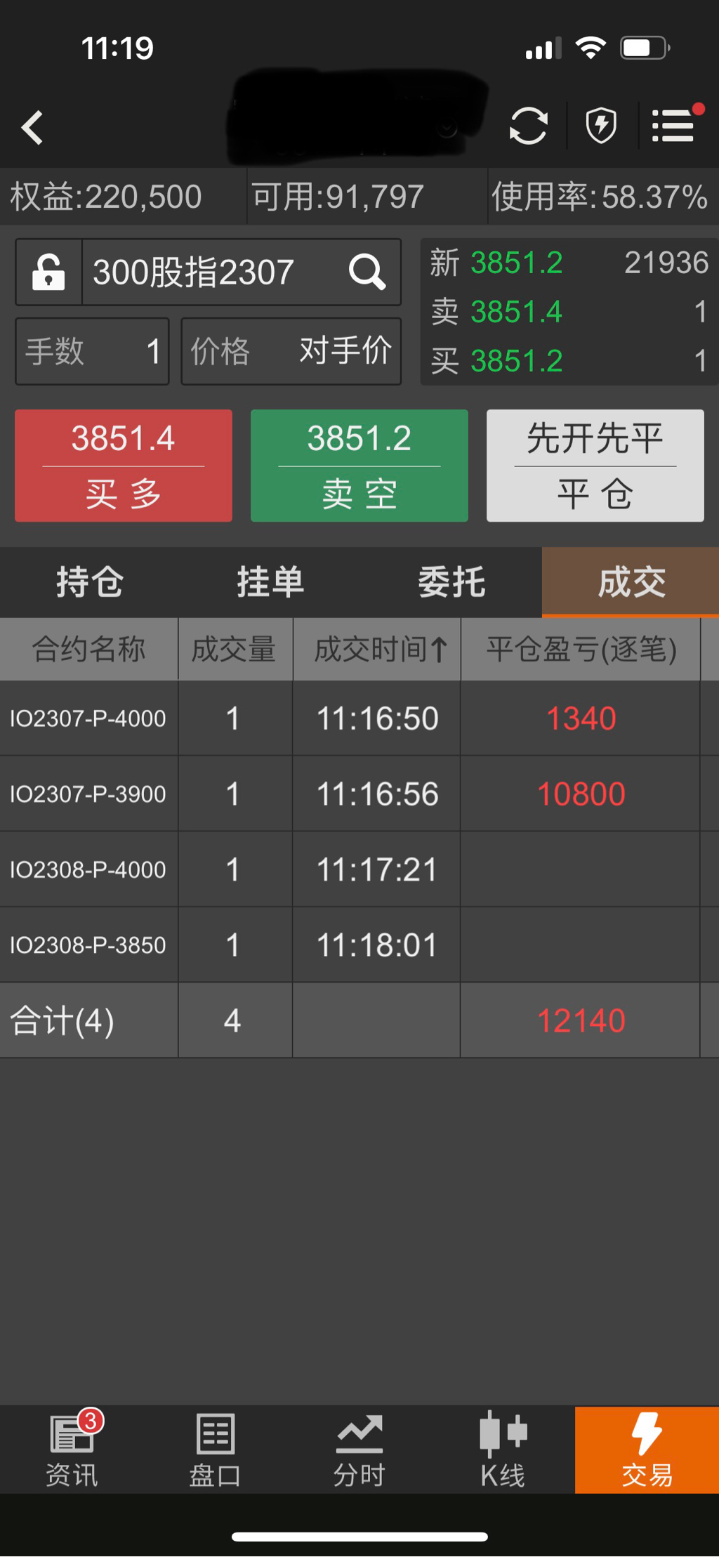 1.20万本金的IO实盘:P4100开仓一手卖沽,指数跌到3800的时候出现了五星级的投资机会,下移并加...