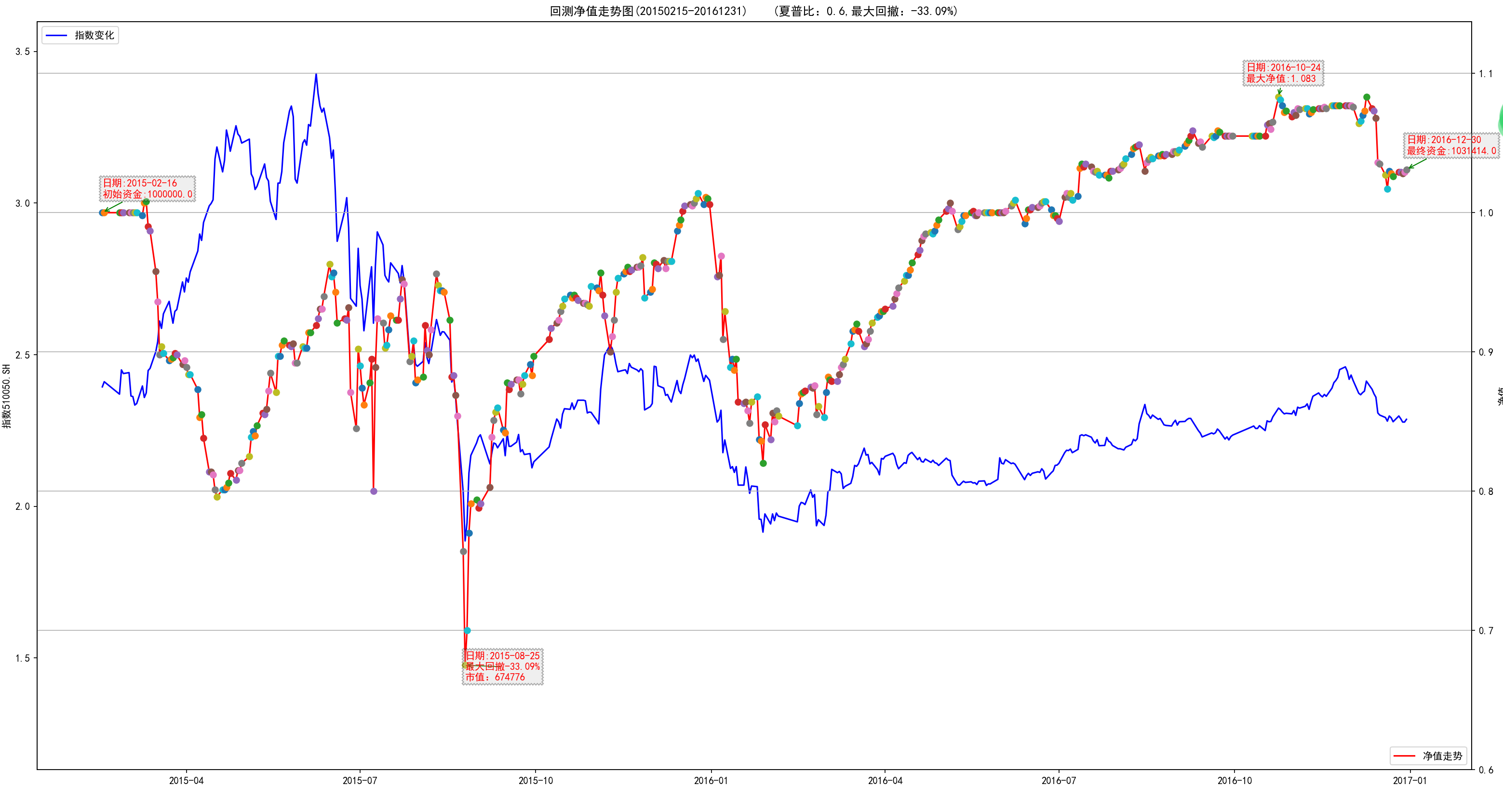 初始资金100万,主要策略是平值双卖50ETF期权(购沽隐波均>0.13或隐波和值>0.3时开始卖下月期权,隐波在0.1和0.13之间则考虑双买(仅在2016年6月底出现过一次)),到期前两天则无条件清仓,或时间价值降低到一定程度后逐渐减仓。购沽卖出的张数约为账户金额/10000张ETF的价值。