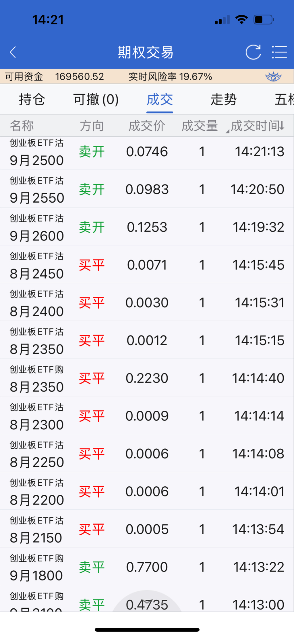 创业板移仓,因为最近创业板上涨比较多,卖沽都变虚值了,落袋盈利,上移到平值2550附近并减少卖沽张数。卖购买购也是平了两组止盈。可以看到风险度已经降到20以下了。这样做就可以不管下跌了,甚至于希望回调,如果卖沽全部上移遇回调是要吃亏的。