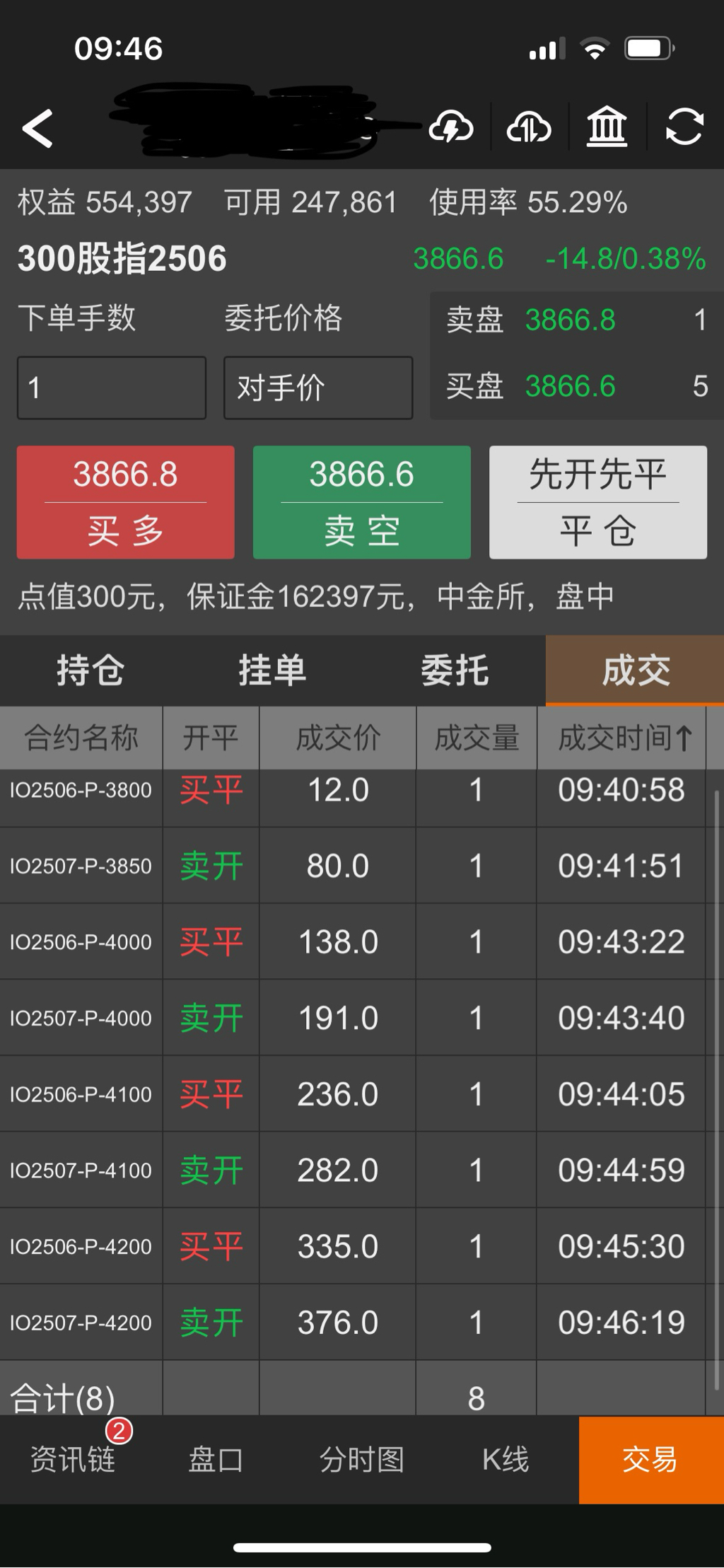 移仓流水20800元,这里面包含了贴水和期权时间价值,今天移仓的理由是回调略有升波且贴水有一点扩大,移仓价差还可以。另外隐波太低,不想做卖购,卖沽3800上移到3850,这个就是持现卖沽替代备兑了。