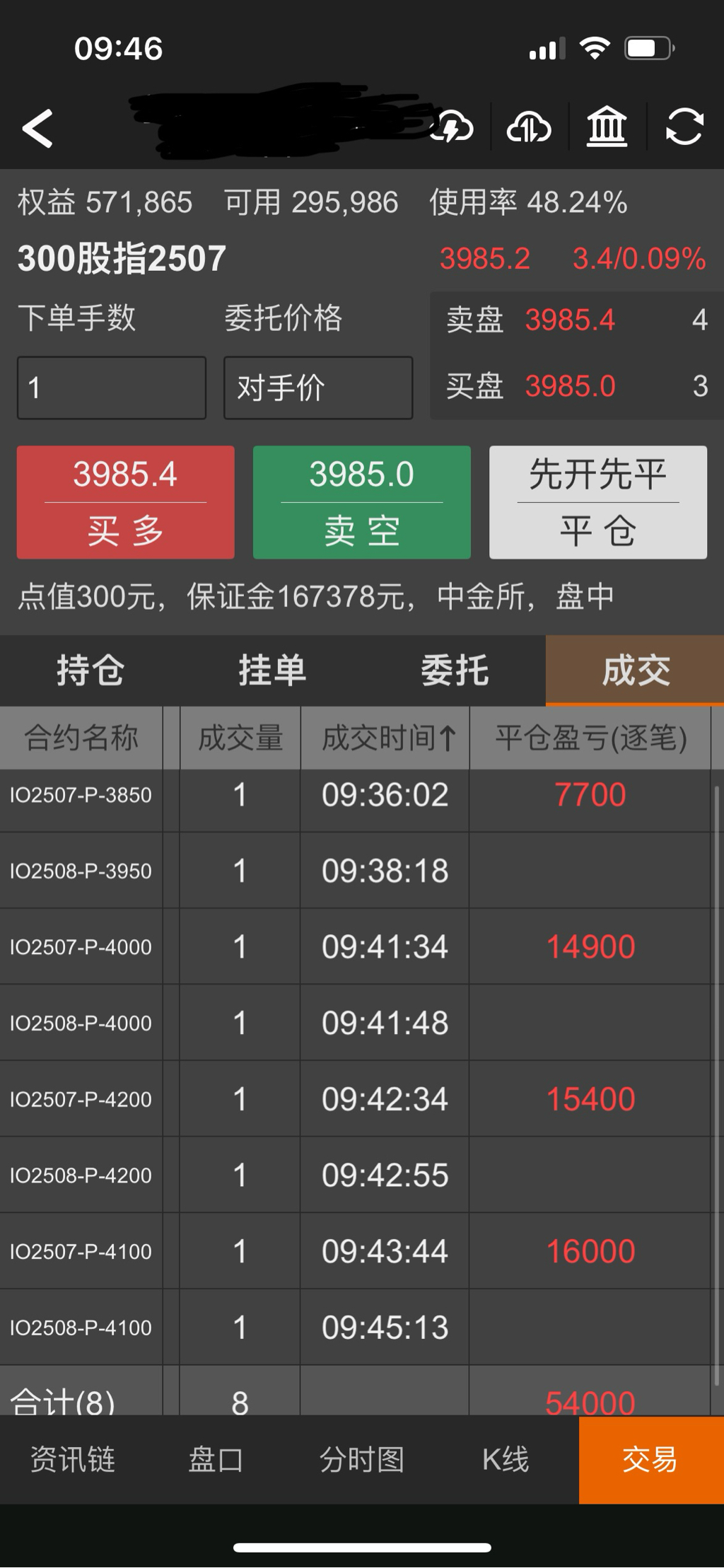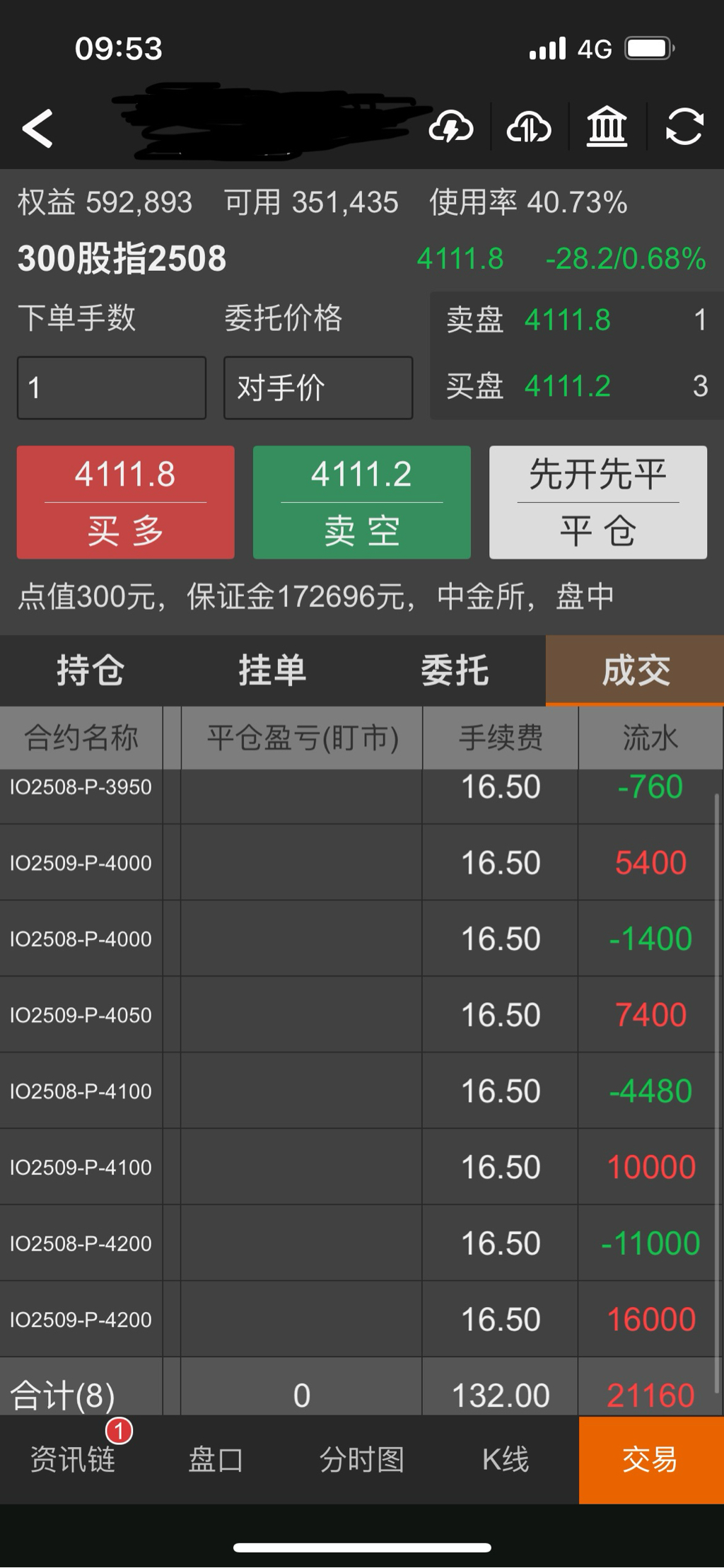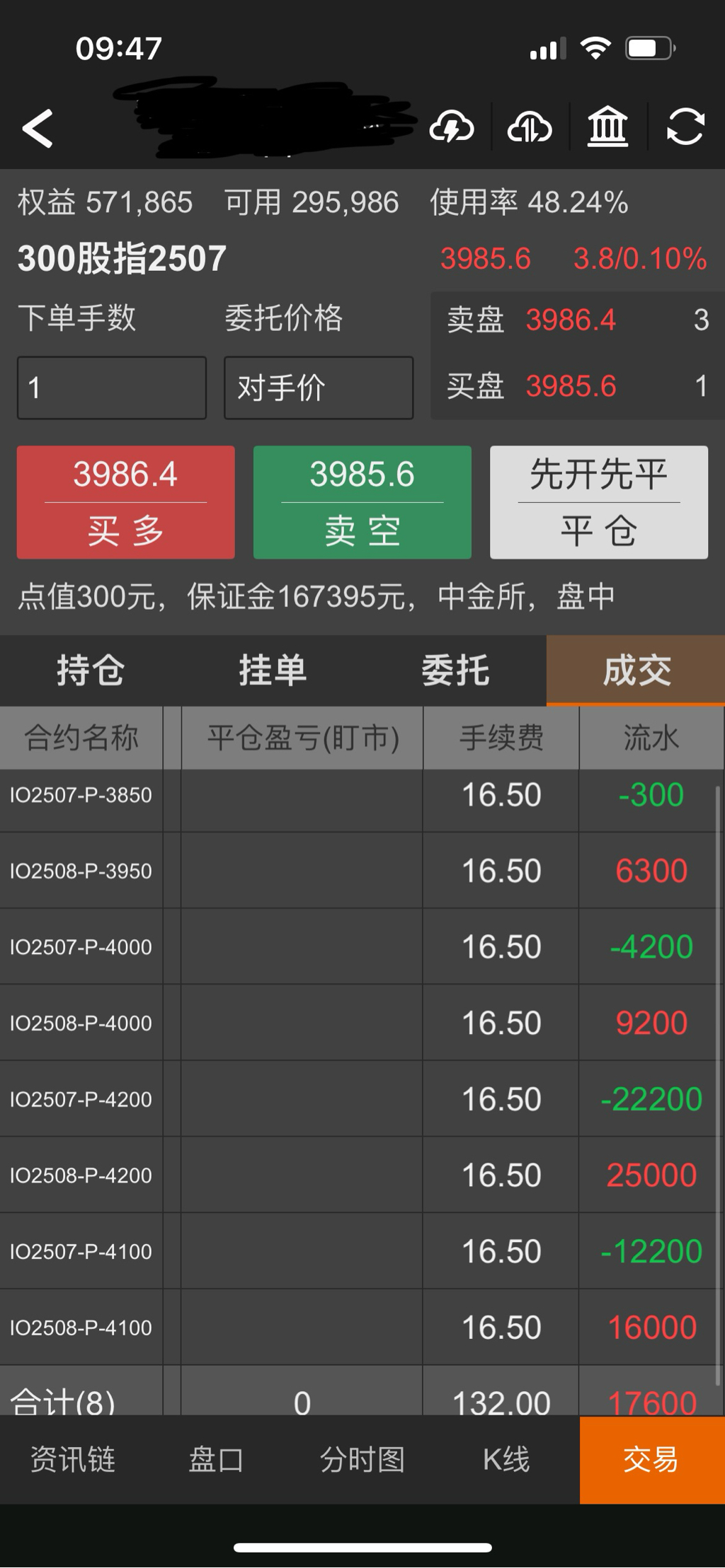 现在IO2506P4000是170点,实值120点,时间价值50点,其中含30点贴水。我看了一下最低费率的账户占用保证金是62206,实际占用资金是45000元左右。没有折扣的账户占用保证金是73928,实际占用资金是57000左右。按4月7日最低点3514来说,要准备400点的下跌空间,预留4万元就差不多了。