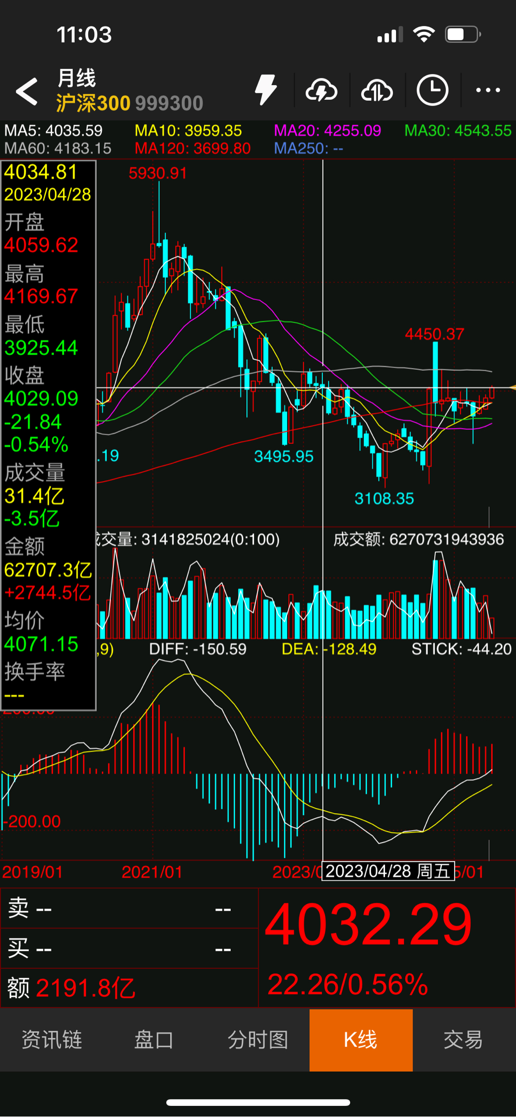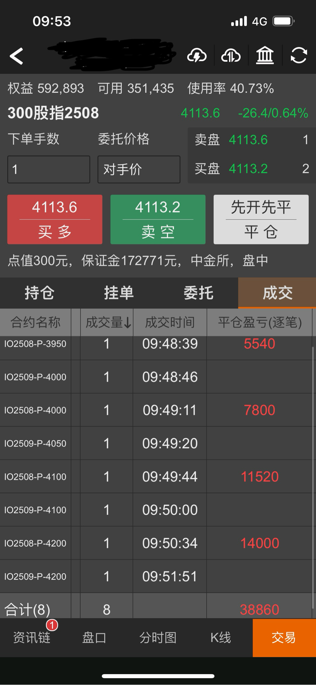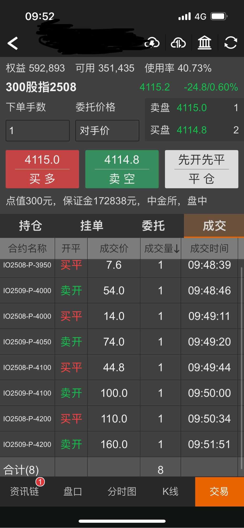 现在IO2506P4000是170点,实值120点,时间价值50点,其中含30点贴水。我看了一下最低费率的账户占用保证金是62206,实际占用资金是45000元左右。没有折扣的账户占用保证金是73928,实际占用资金是57000左右。按4月7日最低点3514来说,要准备400点的下跌空间,预留4万元就差不多了。