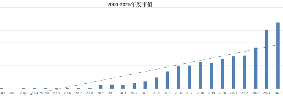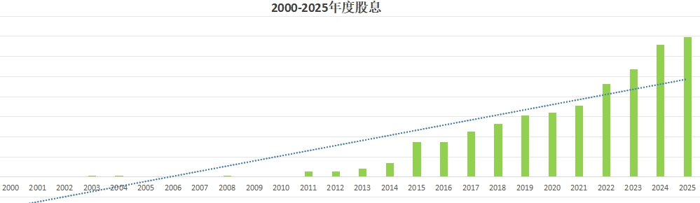 今天为止基本上也算是半年了,算下今年收益12.1%,还好。今年的总市值、年度股息收益都是历年最高。2000-2025年度市值、盈亏、股息额统计。