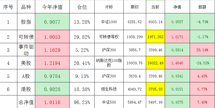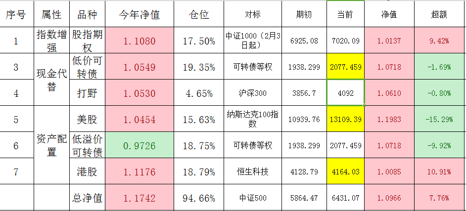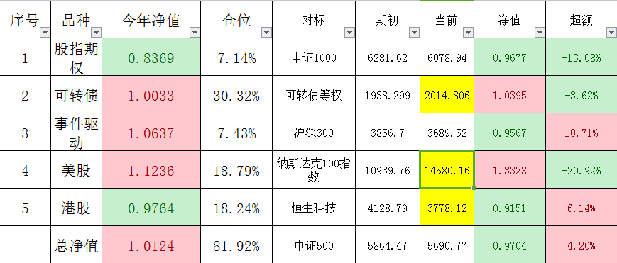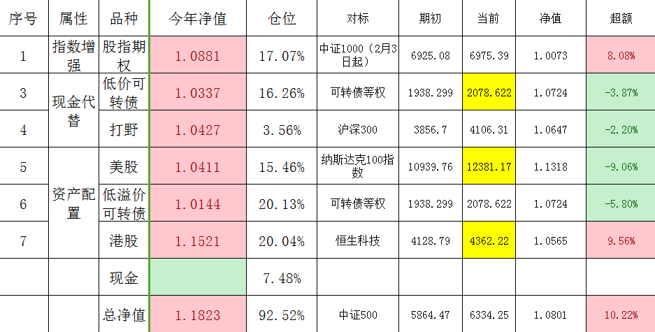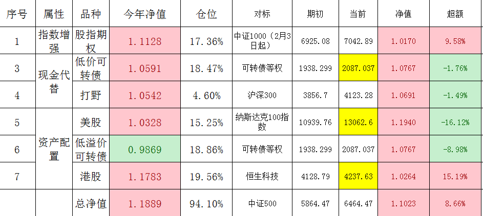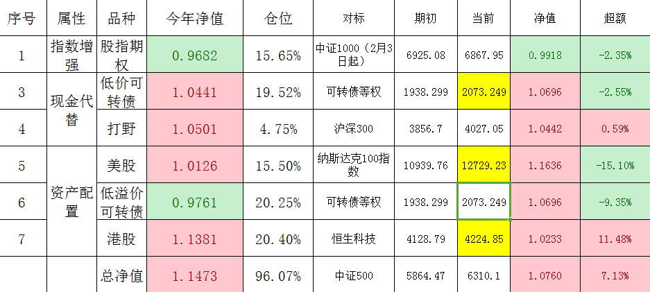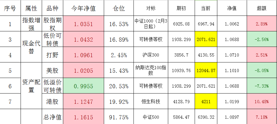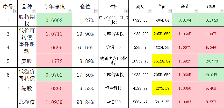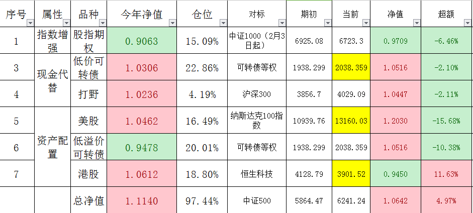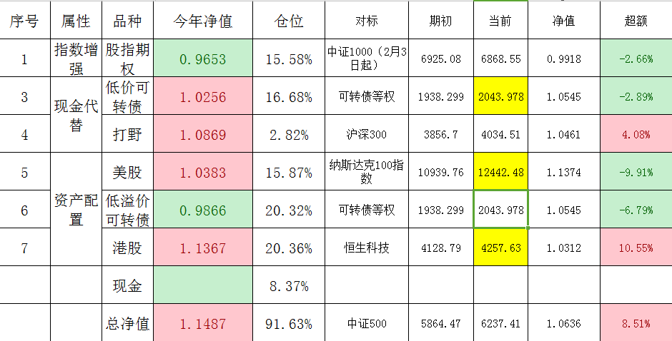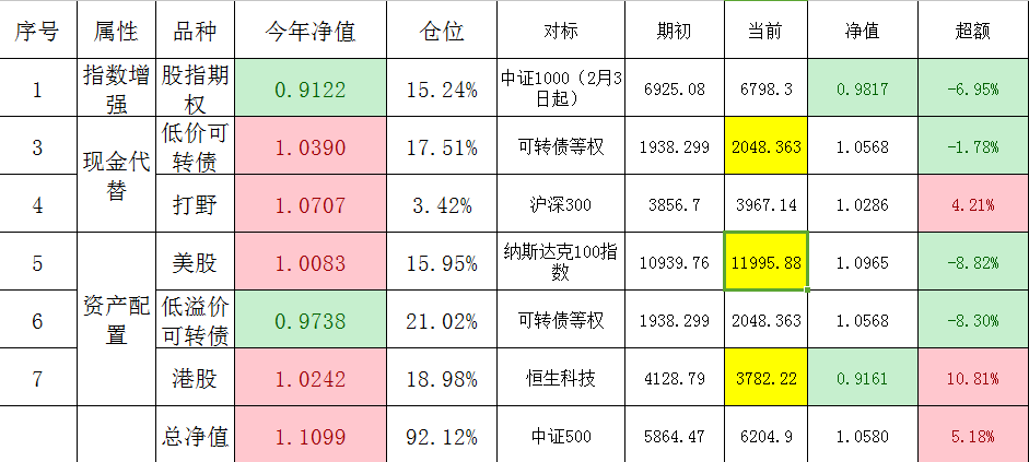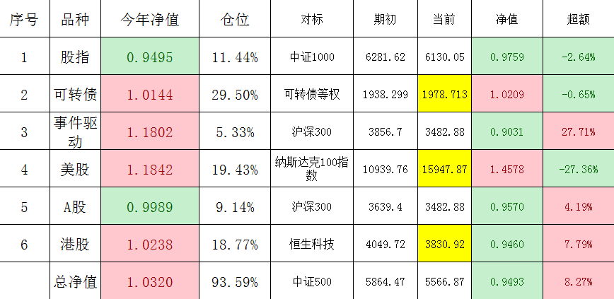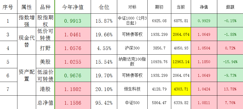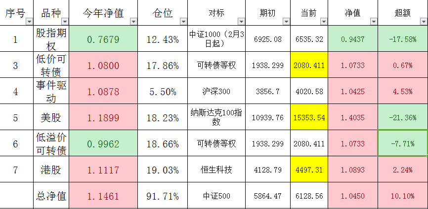 本周净值1.1487 ,仓位 92% ,跑赢中证500约8.51% 。除了打野以外,各个策略均出现回撤,特别是上周刚刚加仓的低溢价策略