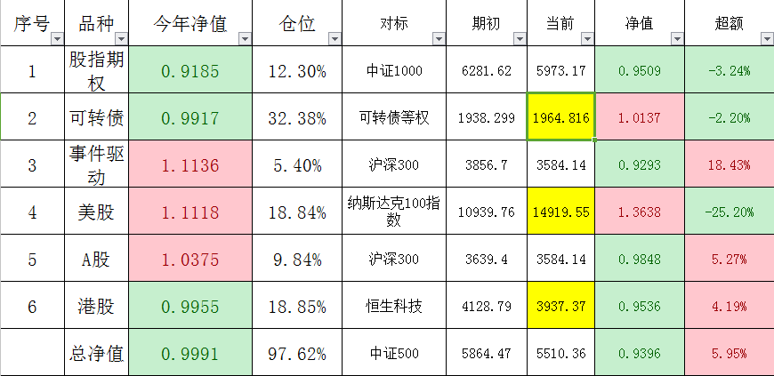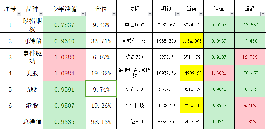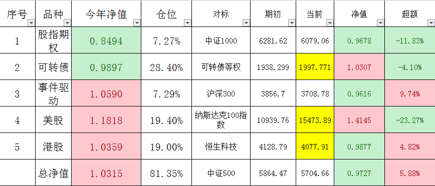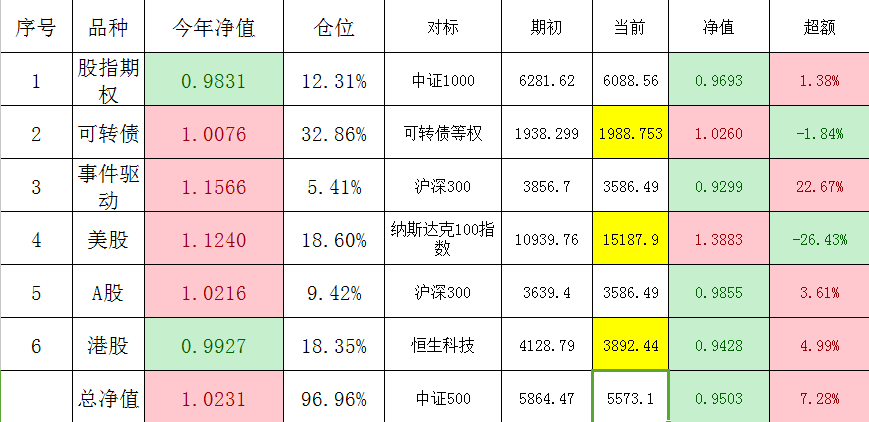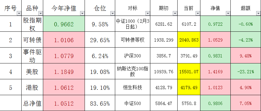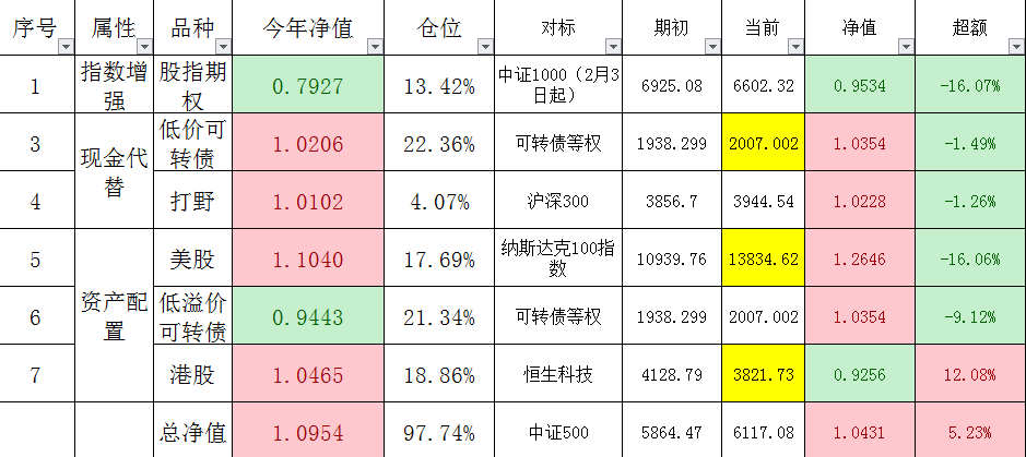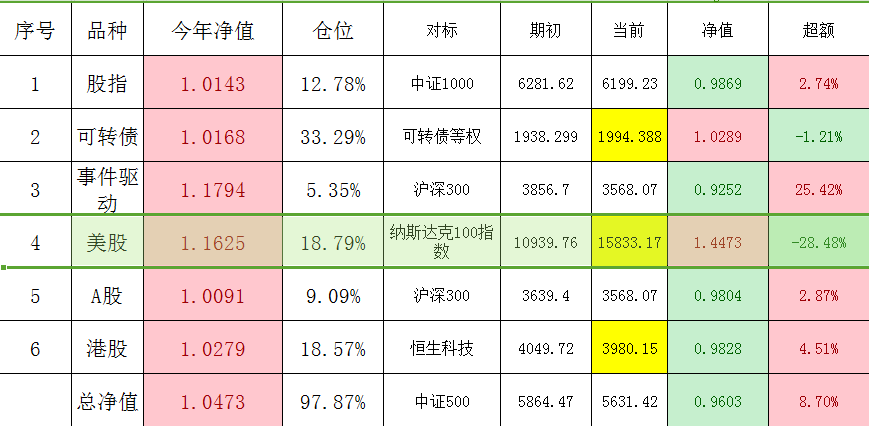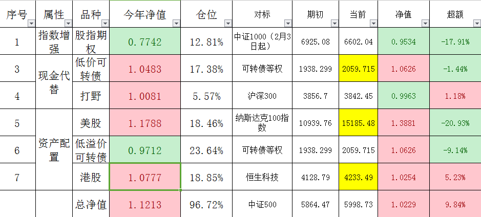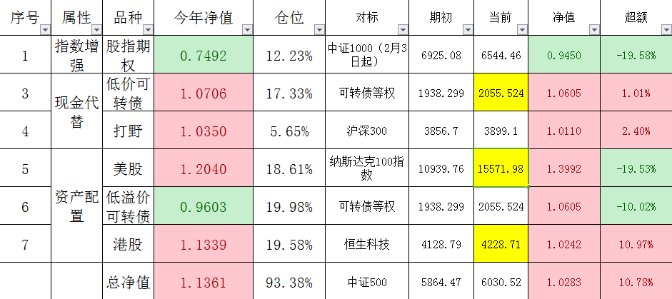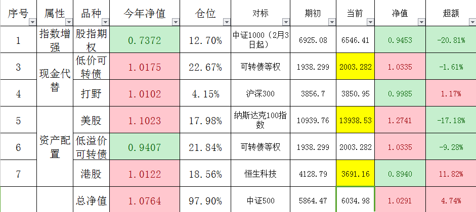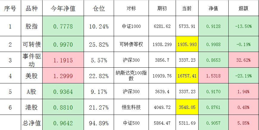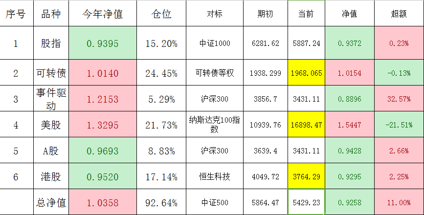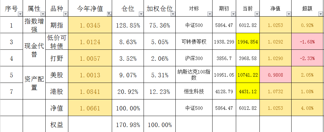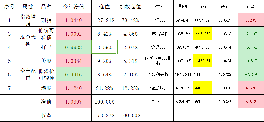 本周净值1.1487 ,仓位 92% ,跑赢中证500约8.51% 。除了打野以外,各个策略均出现回撤,特别是上周刚刚加仓的低溢价策略