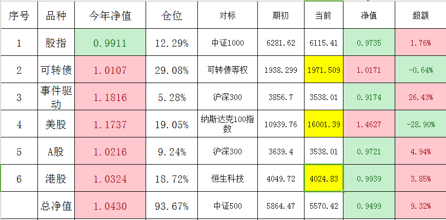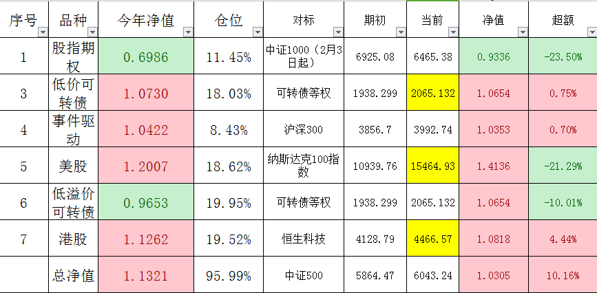 本周净值1.14,仓位 148% ,跑赢中证500约7.87% 。本周操作:周五减了一张im,加仓低溢价与美股,总体仓位降低约90万。从2020年开始吃贴水,经过20/21两年的黄金年代,2022年大幅杀跌的情况下,仍然获得相当不错的超额。但是今天是2301最后交易日,面对2302/2303全面升水,只有忍痛移仓到2306,如果算上分红,基本上就没有贴水,想了半天还是减掉了一张,以后如果继续涨估计就会继续减。今天主要加仓了低溢价,目前仓位已经超过了低价转债。经过1月份的大涨,资产净值基本上要回到2021年12月31日的历史高点了,减点仓位也能接受。要想一直跑赢指数,可能就要承受比指数更大的波动。