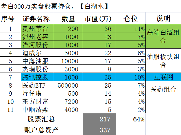 本周账户总资产为337万,增加6万。股票持仓没有变化,股票市值从208万增加到217万,仓位从63%增加到64%。