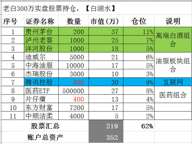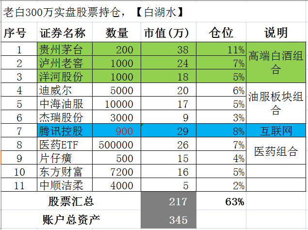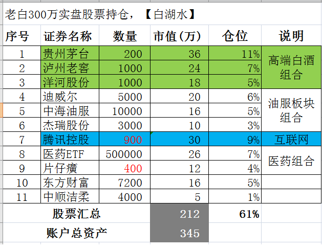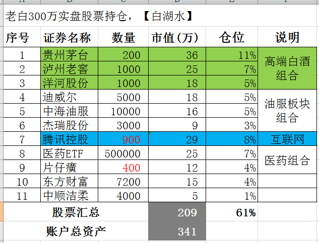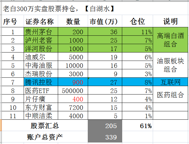 如下是股票持仓,贵州茅台、泸州老窖、洋河股份构成高端白酒组合,占总22%的仓位,这是组合的压仓石,长期持有,任凭股市的涨跌,不为所动。
