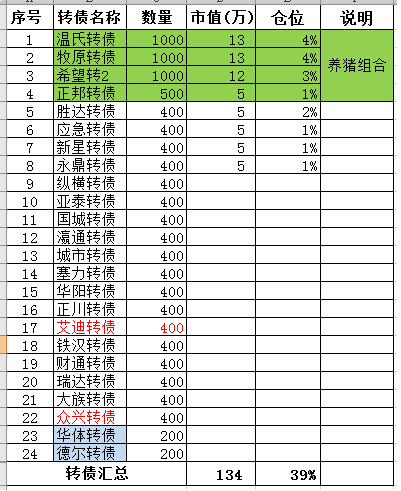 可转债持仓基本上是130元以下的债性可转债,除了养猪板块是重点配置外,其它是低价兼顾低溢价的摊大饼策略,一个标准饼400张,单支转债占约1%的总仓位。由于股票上涨,可转债仓位下降了到了36%,降低了一个百分点。