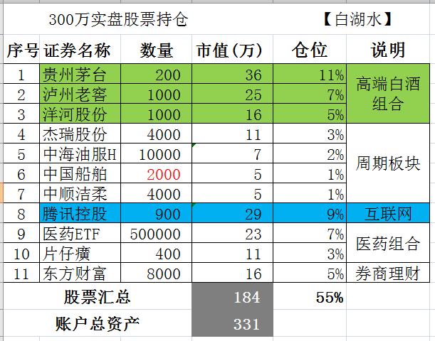 账户总资产约331万,股票占约2/3仓位,可转债占1/3仓位。