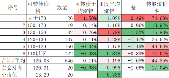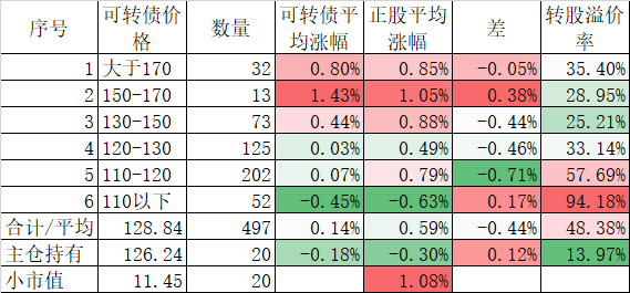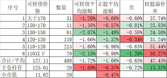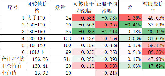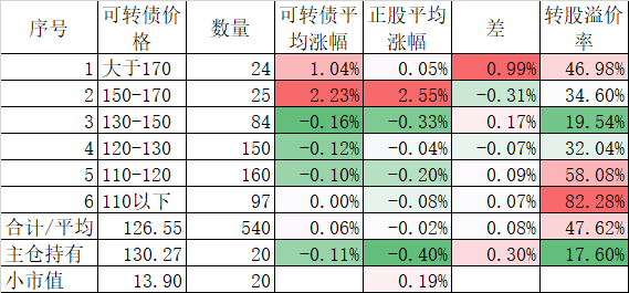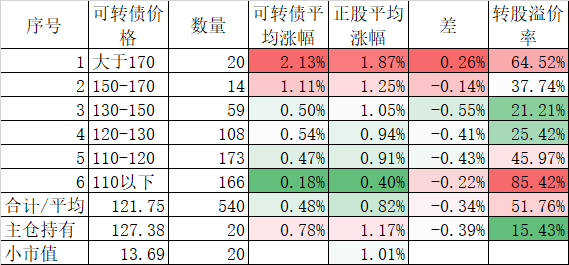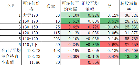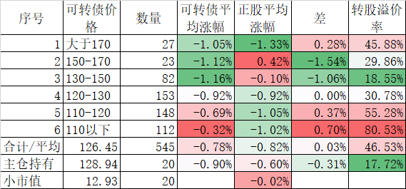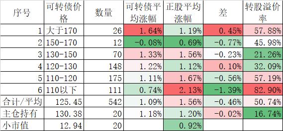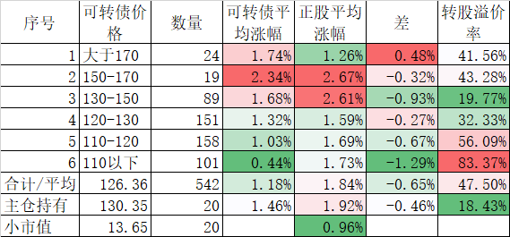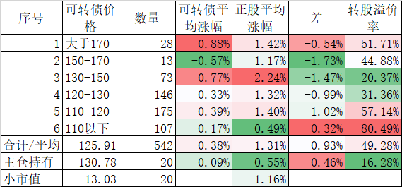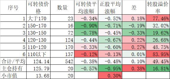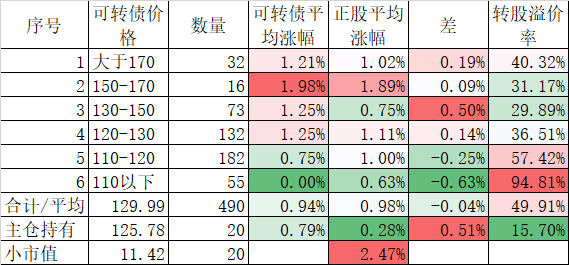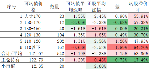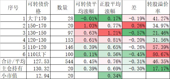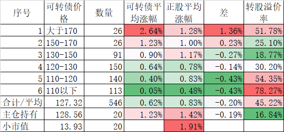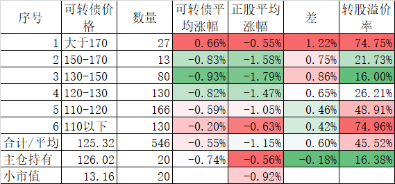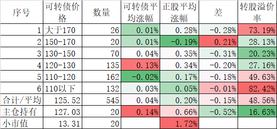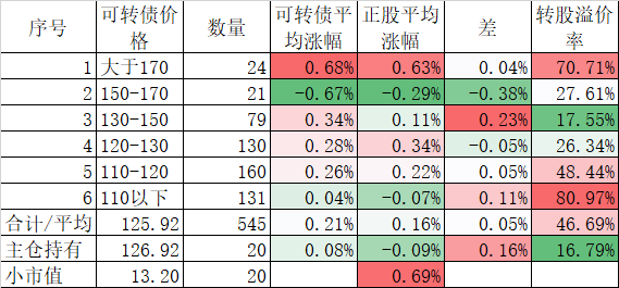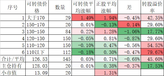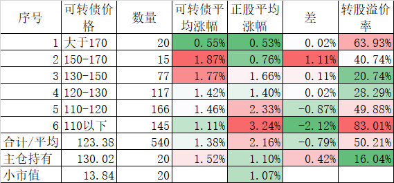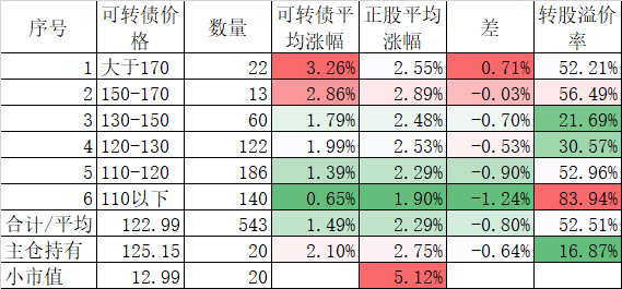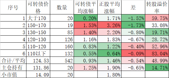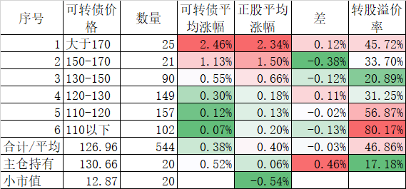 542只可转债平均涨0.49%,对应正股平均涨1.43%。我的主仓持有的20只可转债平均涨1.16%,对应正股平均涨2.13%。实际账户平均也是涨了1.16%。