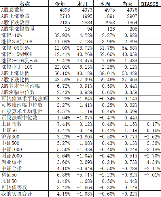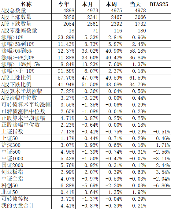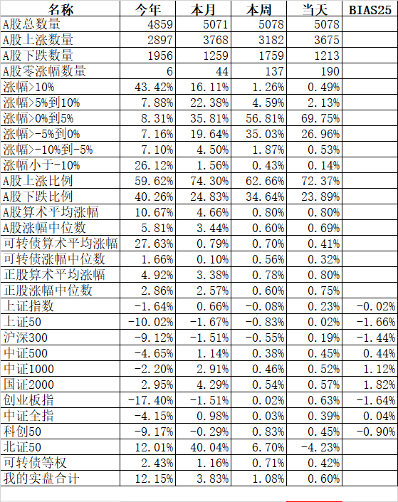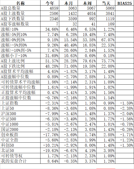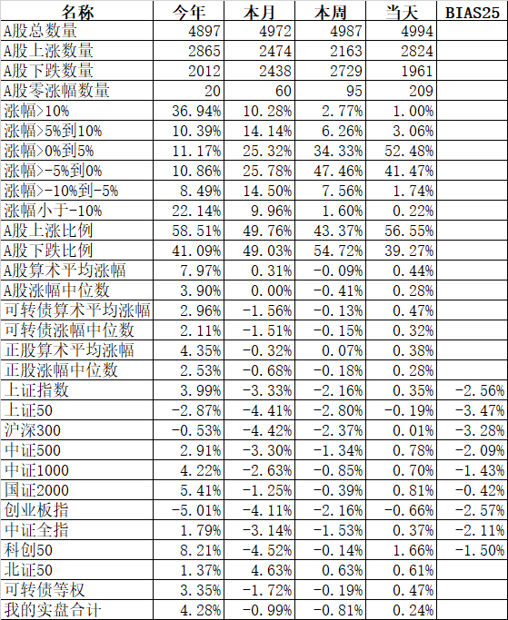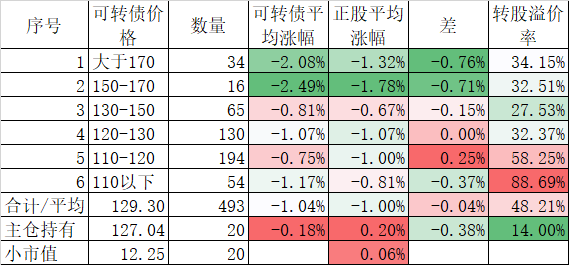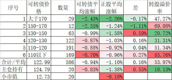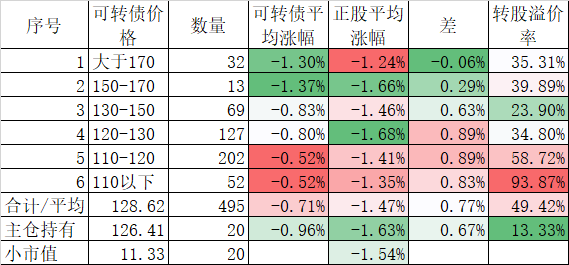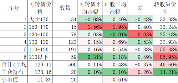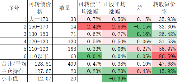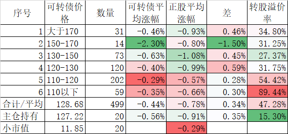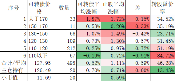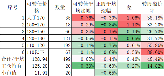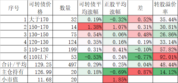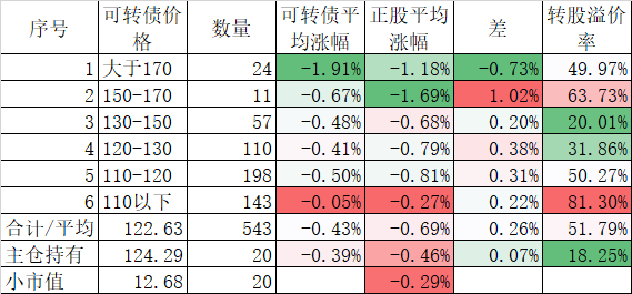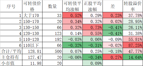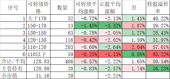 542只可转债平均涨0.49%,对应正股平均涨1.43%。我的主仓持有的20只可转债平均涨1.16%,对应正股平均涨2.13%。实际账户平均也是涨了1.16%。