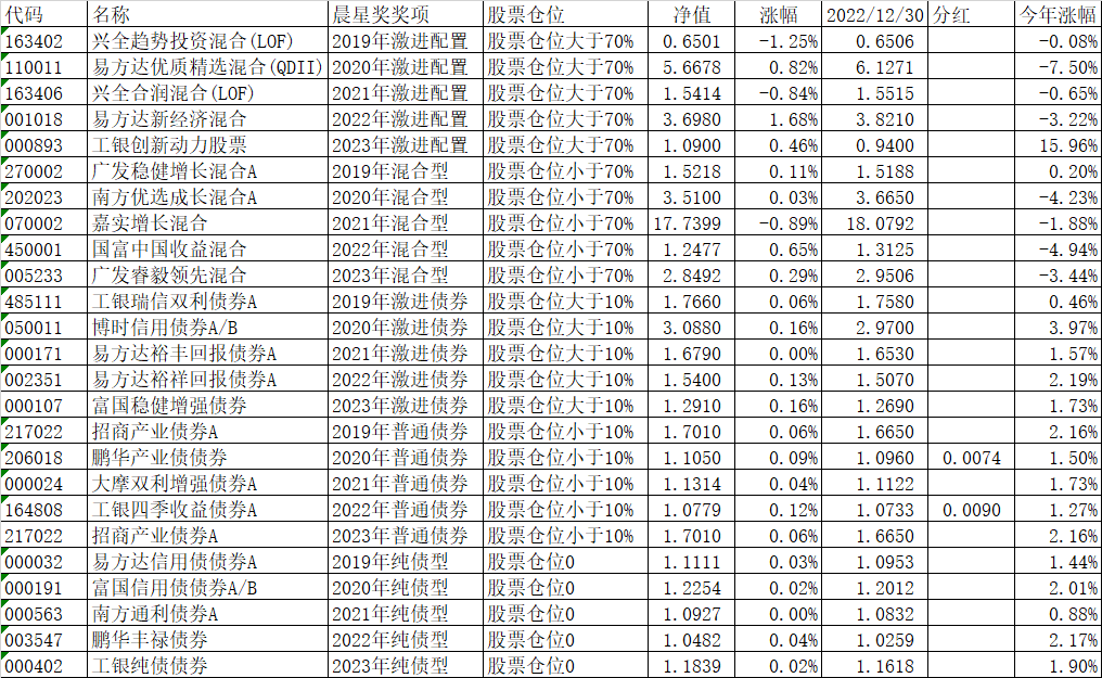 除了部分QDII和FOF等年底最终净值还没出来,其他的基金2023年的业绩都已经全部尘埃落定了,汇总结果如下:
