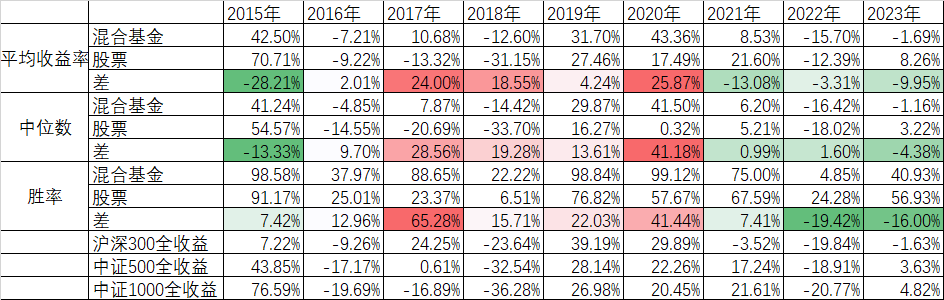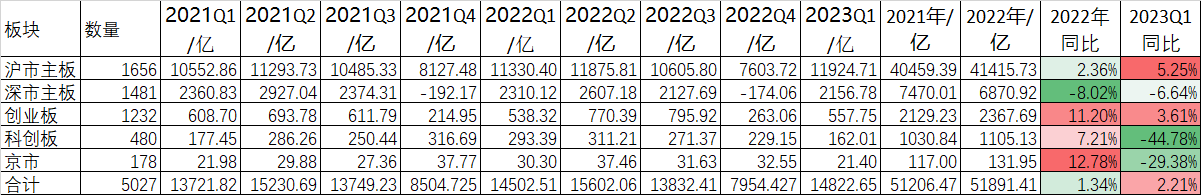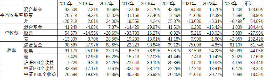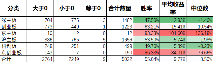 2023年的股市已经落下帷幕了,我从choice里导出了所有A股的数据,剔除了今年的新股,先按照类别统计胜率、平均收益率和中位数如下: