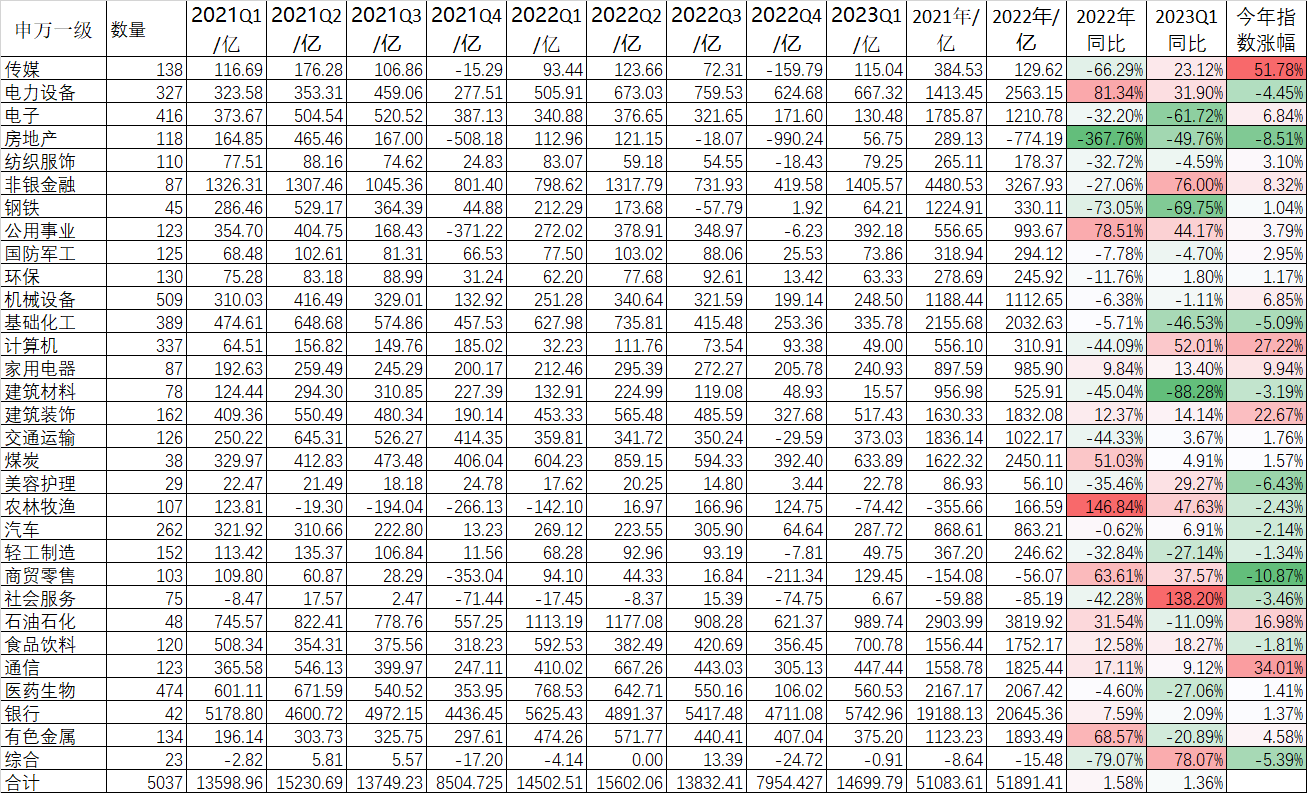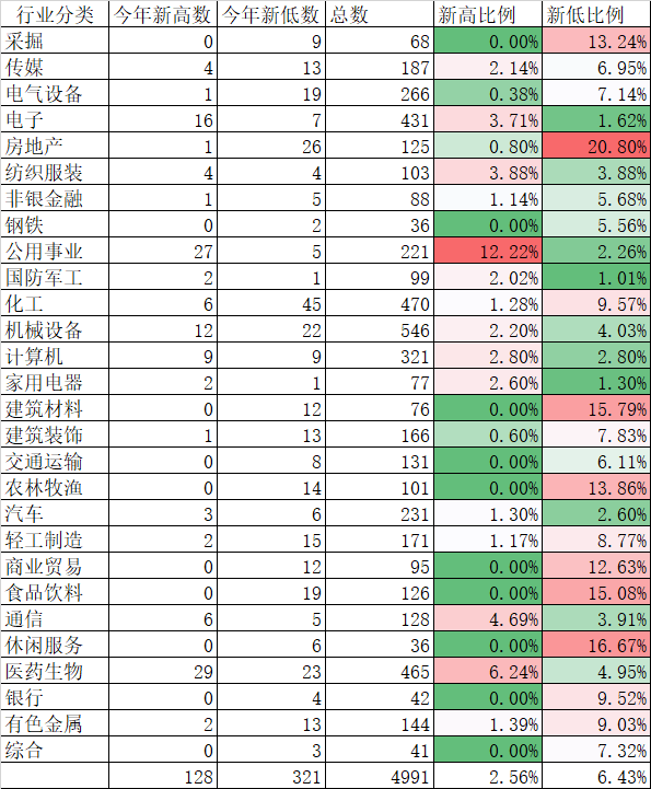我们再按照最新的申万一级行业指数分类统计,其中choice中的创业板股票不知道为什么没有给划分行业,我们也另外做了统计: