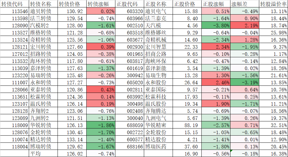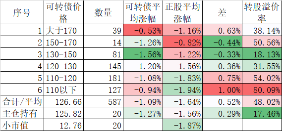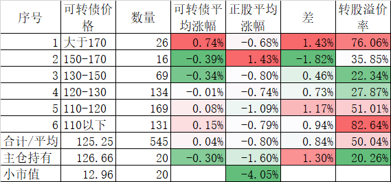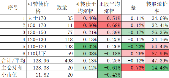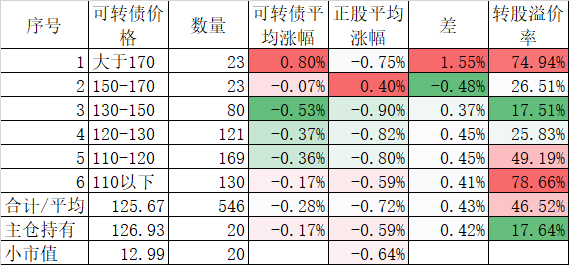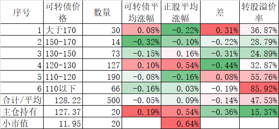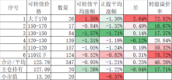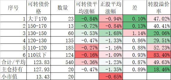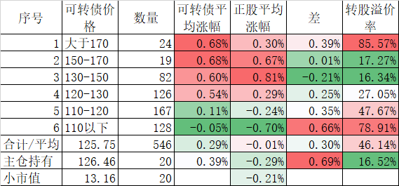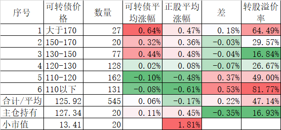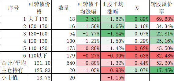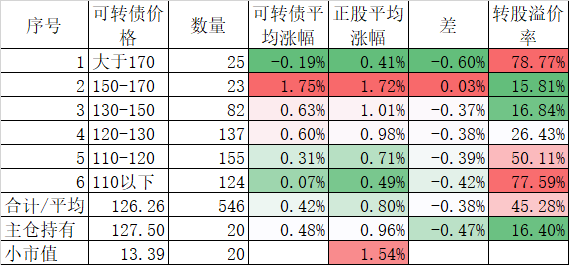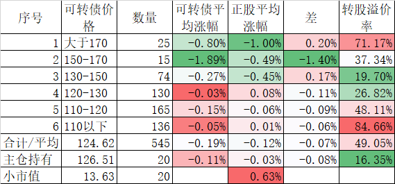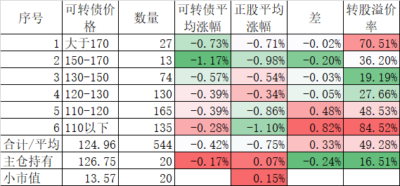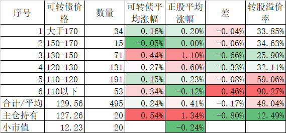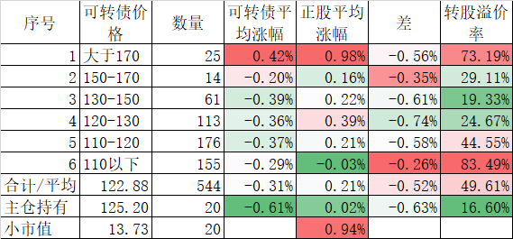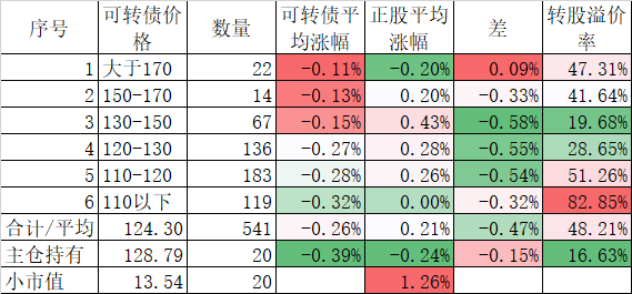 545只可转债平均上涨0.04%,对应的正股平均上涨0.20%,正股的表现弱于全市场,可转债弱于正股倒是正常。