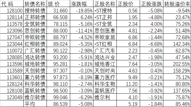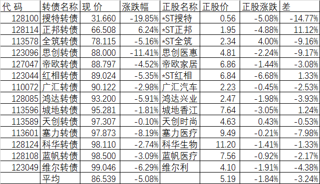 我自己的主仓20只可转债到收盘平均跌0.30%,对应正股平均跌1.60%。实际账户合计今天跌0.17%,主要是换入的九洲转2和斯莱转债都上涨了。