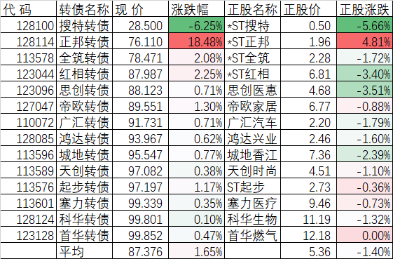 545只可转债平均上涨0.04%,对应正股平均下跌0.80%。可转债今天算是非常抗跌了。