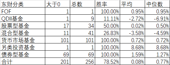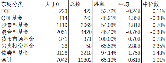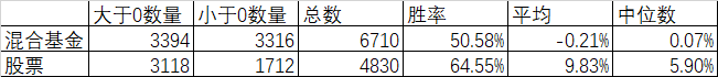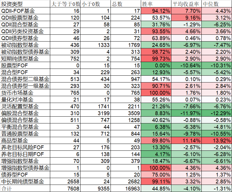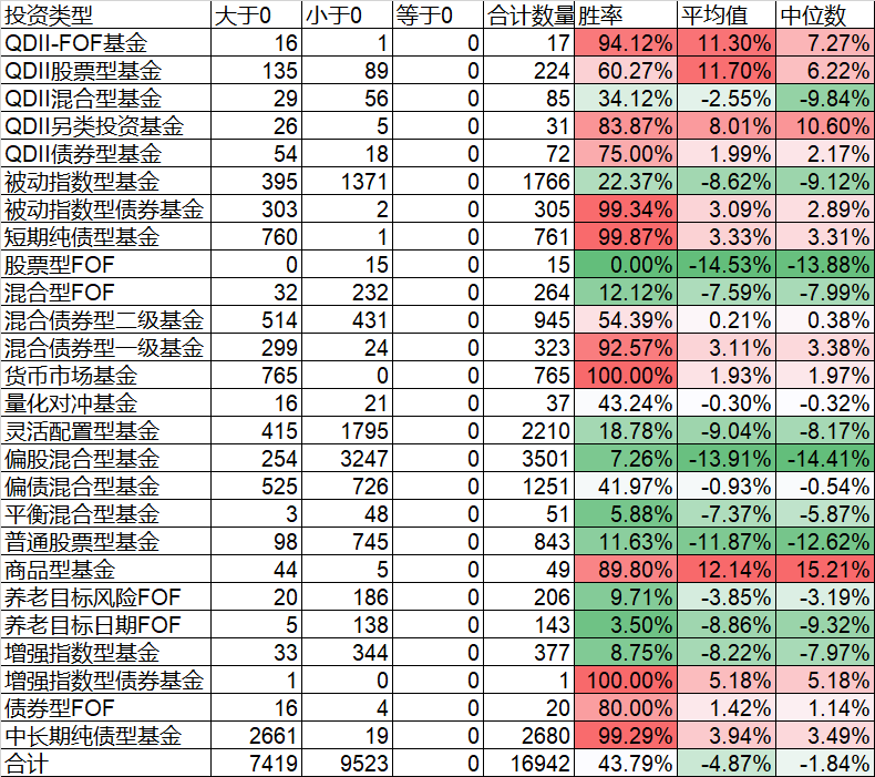 按照choice的数据,一共有16942只基金,是A股数量的3倍,今年的胜率才43.79%,平均收益率-4.87%,中位数-1.84%。