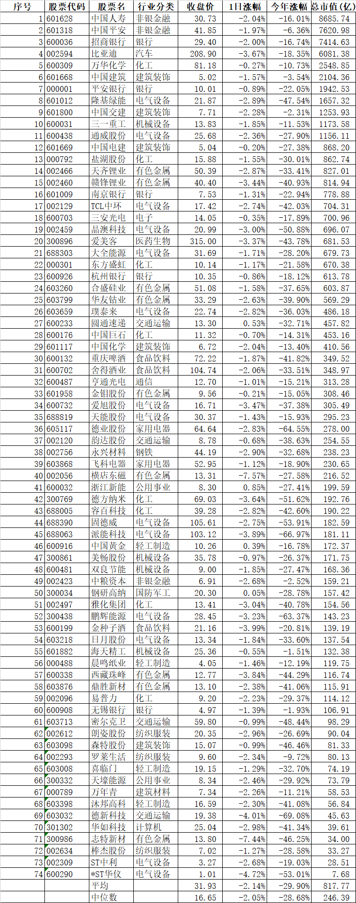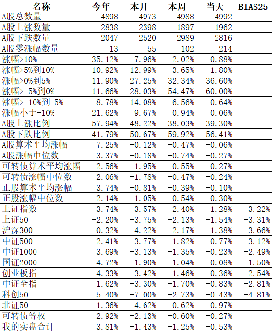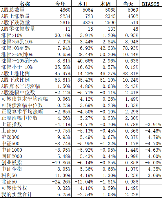 3912只个股上涨,1048只个股下跌,涨幅中位数0.97%。今天盘中有415只个股创出今年新低,大部分收盘都收红了,只有139只收盘依然发绿,按照市值排名有五粮液(-2.61%)、泸州老窖(-4.45%)、海尔智家(-0.91%)、万科A(-1.39%)、保利发展(-1.64%)、通威股份(-0.17%)、青岛啤酒(-0.24%)、广汽集团(-1.29%)、上海机场(-0.29%)、招商蛇口(-2.19%),大部分都是酒类特别是白酒、房地产等行业。