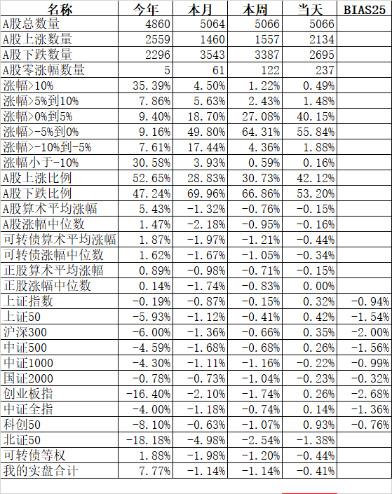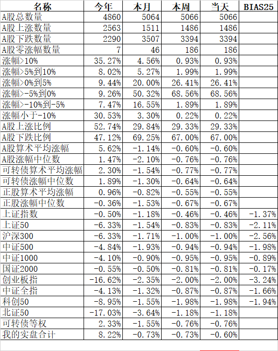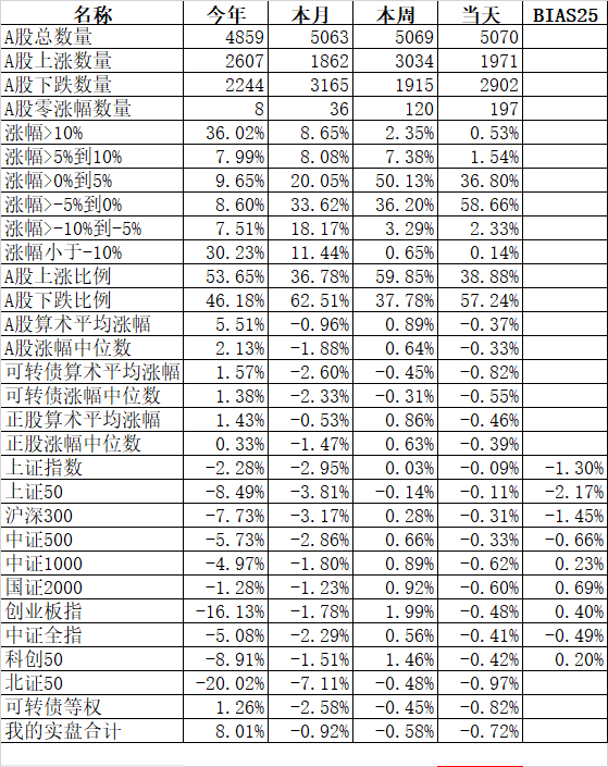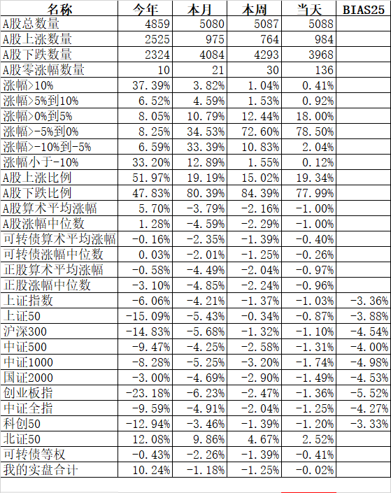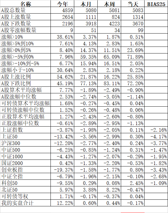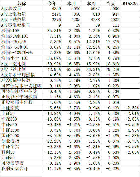 今年到底是牛市还是熊市?上证指数在3000点下已经第三天了,这个不温不火的萎靡样,今年估计就在水下了。 主流宽基指数只有北证50大涨2.34%,领跌的还是上证50跌0.40%、创业板指跌0.25%。跌幅都非常小。申万一级行业指数中领涨的传媒涨2.06%、计算机涨1.56%、家用电器涨1.01%;医药生物跌1.08%、、基础化工跌0.91%、建筑材料跌0.80%。1723只个股上涨,3169只个股...犹记得三年前手里拿着一堆小盘转债,看着大蓝筹一路绝尘。