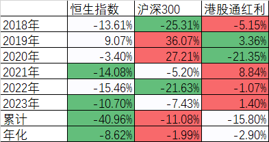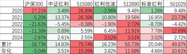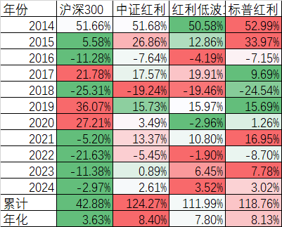 我们再把这3个红利指数和沪深300指数从2014年开始的年度收益率做个对比如下: