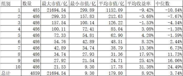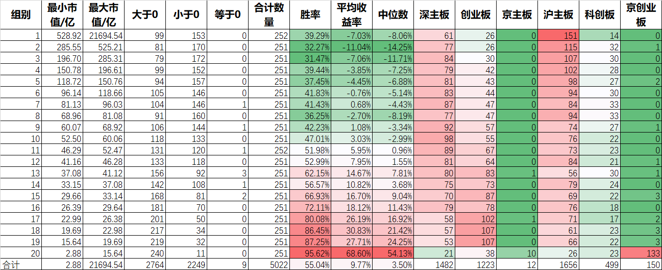 和板块、行业因素相比,市值对今年涨跌的影响更大。把A股的5022只股票按照去年年底的市值排序分成20组,计算对应的胜率、平均收益率和中位数: