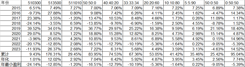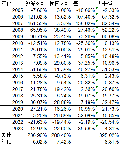 但如果我们做一次以年度为单位的再平衡,不管是80%的股(沪深300指数)+20%的债(国债),还是股5:债5,还是股2债8,最终收益率都高于沪深300指数和国债指数。