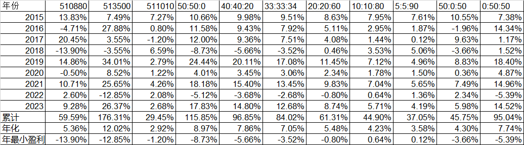 虽然股5债5最高,但你看股2债8方案,它的优点是回撤非常少,我们简单的看一下最大年度亏损,发生在2008年大熊市,才亏损了5.66%,而股5债5的最大年度亏损是28.27%、股8债2最大年度亏损是50.88%。