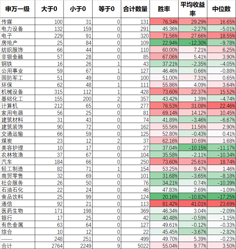 给人感觉很差的医药生物行业,虽然胜率只有46.34%,但今年平均收益率是正的3.04%,中位数也仅仅是负的2.09%。并没有想象的那么糟糕。