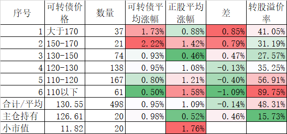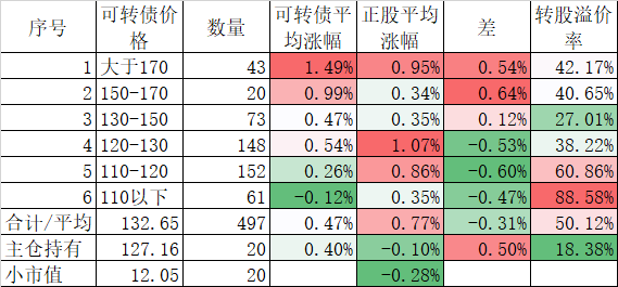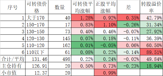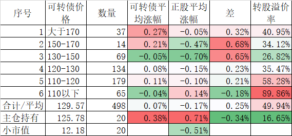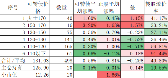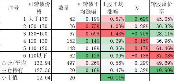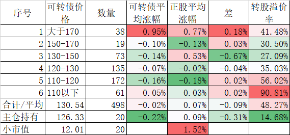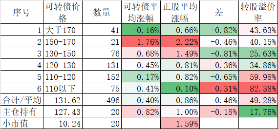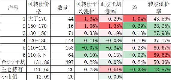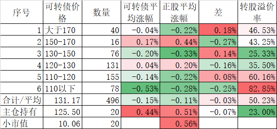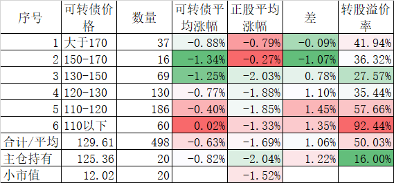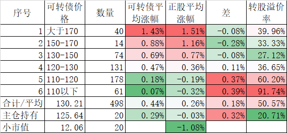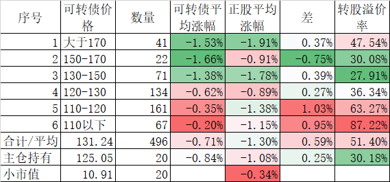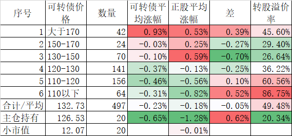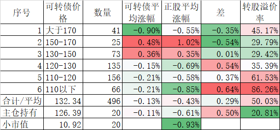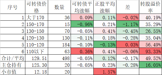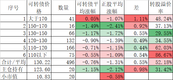 和指数相比,可转债今天算是不错的,500只可转债平均下跌0.05%,对应正股平均上涨0.09%。今天我的持仓总算跑赢了一次,主要靠孚日和贵燃两只可转债涨幅超过3%,不过和它们的正股涨停相比,实在是弱,过去正股涨停可转债大概率会冲高到7%以上,现在勉强站上3%,而且两只可转债对应的溢价率分别只有4.40%和1.87%。所以实在不舍得卖了着两只可转债,虽然很有可能明天会调整。