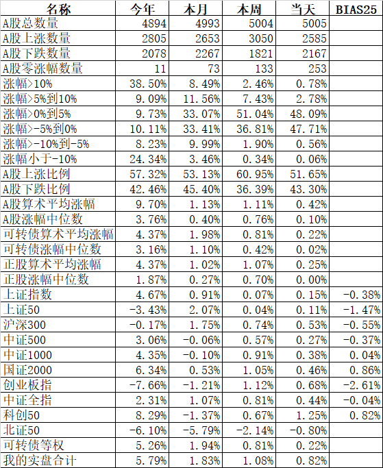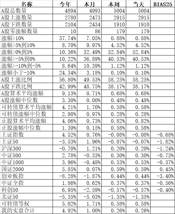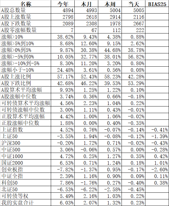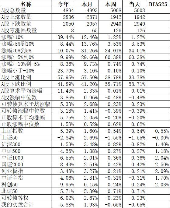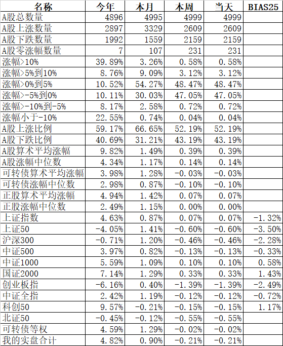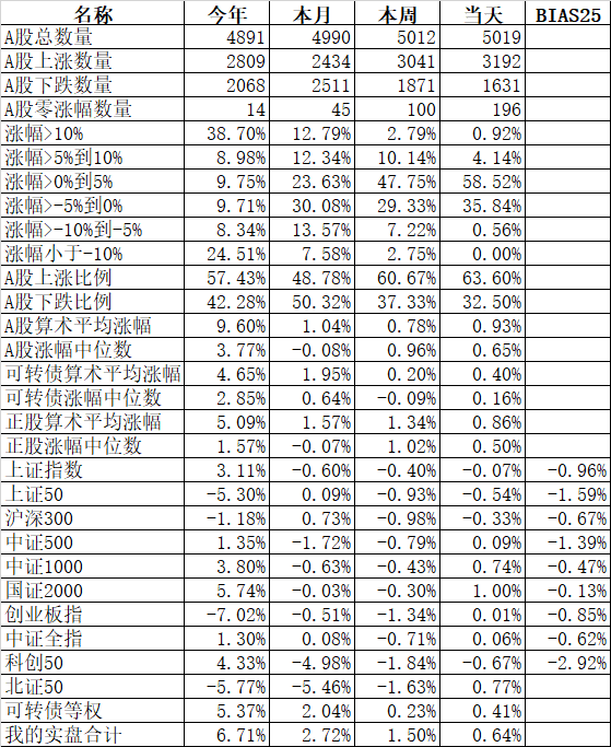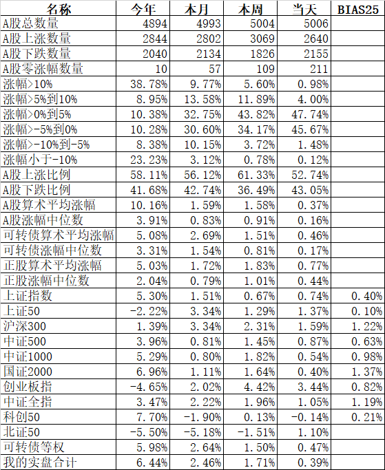今天2101只个股上涨,2703只个股下跌,涨幅中位数为负的0.20%,还算不错。