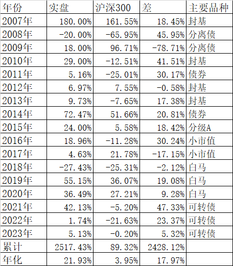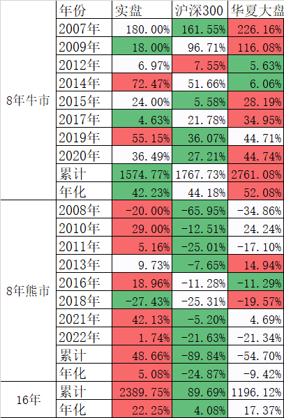 如果不算今年,那么我入市16年,从2007年到2022年,整整16年,收益翻了近24倍,同期沪深300指数只涨了不到1倍,就是和期间最好的公募基金华夏大盘相比,也超过了整整一倍。