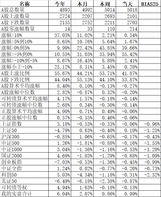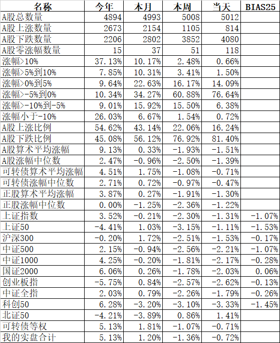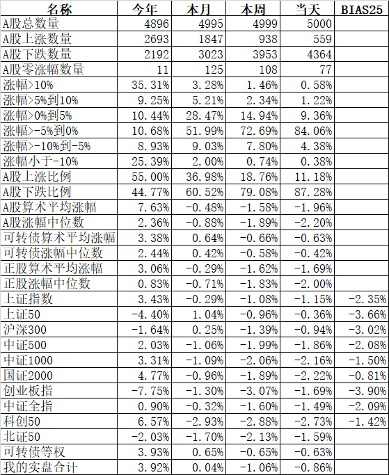 连续跑输等权,但有个值得安慰的低开是在大家的预料之中的,但看上午的趋势,以为会低开高走的,却不料下午一路下滑毫无反弹。 今天主流宽基指数中跌幅最小的科创50跌0.97%,跌幅最大的国证2000跌2.21%,中证1000跌1.95%。上证50今天创出今年新低。本来很多人想中特估会利好上证50,偏偏今年主流规模指数中上证50最弱,国证2000最强。市场是不以人的意志为转移的。申万一级行业指数中唯一上...