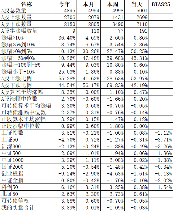 今天跌幅最小的中证1000跌1.02%、中证500跌1.03;跌幅最大的上证50和科创50均下跌了1.55%,只有一个北证50还涨了0.42%。