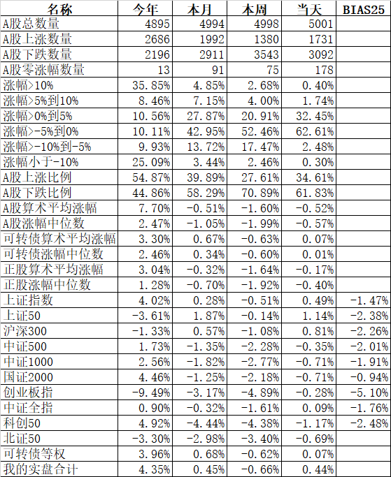 个股依然是涨少跌多,1962只个股上涨,2816只个股下跌,涨幅中位数为负0.24%,比起指数来好很多了。今天隆基绿能、万科A、上汽集团、保利发展、中国国航、海螺水泥、上海机场、中国电建、南方航空、温氏股份、联影医疗、航发动力、中国东航、爱美客、招商蛇口、南京银行、海航控股等232只股票盘中创出今年新低。