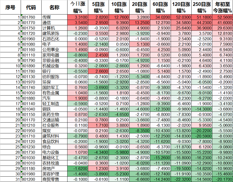 申万一级行业指数中领涨的通信涨1.61%、公用事业涨1.29%、电力设备涨0.74%;领跌的传媒跌2.33%、农林牧渔和商贸零售均下跌1.39%。
