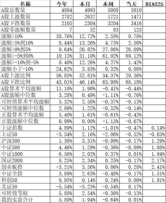 个股涨少跌多,1138只个股上涨,3723只个股下跌,涨幅中位数为负的0.95%。
