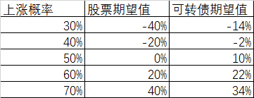 我们假定预判当年牛市的概率是60%,熊市的概率是40%,我们计算股票和转债两个期望值,我们假定股票在牛市的时候上涨20%,熊市的时候跌10%;转债在牛市的时候涨16%,熊市的时候跌2%,那么在第一种可能性(涨60%概率跌40%概率)下,股票的期望值=60%*20%+40%*(-10%)=8.00%,可转债的期望值=60%*16%+40%(-2%)=8.80%,显然转债的期望值比股票大。同样计算第二种可能性(涨70%概率跌30%概率)下,股票的期望值是11%,转债的期望值是10.60%,也就是说市场涨的可能性大的情况下,直接选择股票相对转债的期望值更大;反之则转债的期望值比股票大。