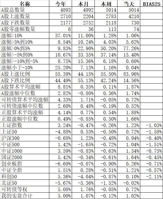 今天个股也是大翻身,4210只个股上涨,只有730只个股下跌,涨幅中位数1.74%。