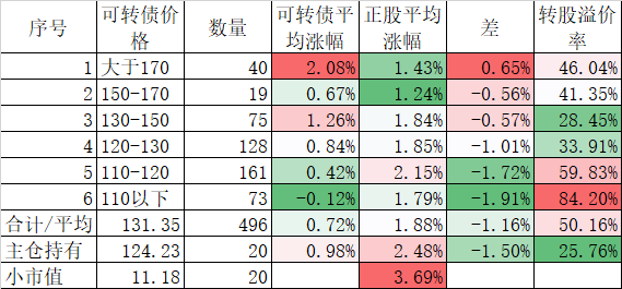今天496只可转债平均下跌0.15%,对应的正股平均下跌0.11%。整体情况还算正常。昨天折价5.57%的正邦转债,被转股了3.975亿。今天正股果然一开盘就在跌停板上,整整一天被封的死死的,最终才成交了5000多万,大部分裸套者都被闷死。今天到收盘又有4.38%的折价率,估计不会有昨天那么多人转股,但这样低位折价转股,没几天可能大部分都转成股票了。公司这样付出的代价是最小的了。以后不排除其他公司有样学样。