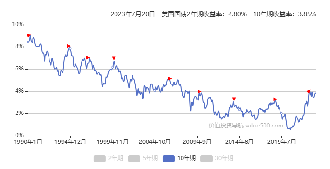 这是美国十年期国债利率走势图,从1990-2023年。图片里标注的每一个红色箭头均是利率阶段性高点,事后看都对应一次重大金融事件。
