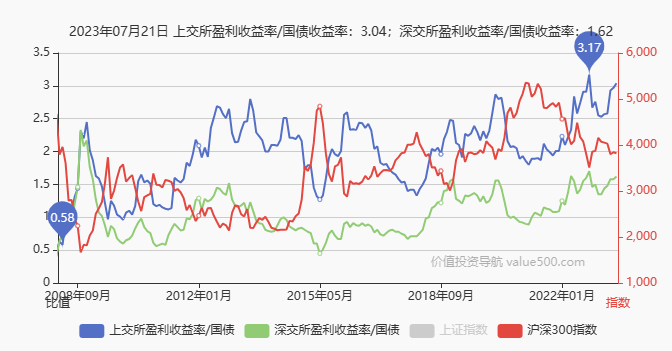 图表里面300股债比指标再次来到高位(蓝色线),是2008年到2023年的漫长历史高位。最高点是去年10月创造的。当时300指数3500点,而现在3800点。指数底部抬高是因为业绩在正增长推升价格(点位)上升(上半年GDP还是超过5%的),而股债比指标重新回到高位还得益于无风险利率的下降。也就是当前指数点位的性价比不比去年10月低多少。
