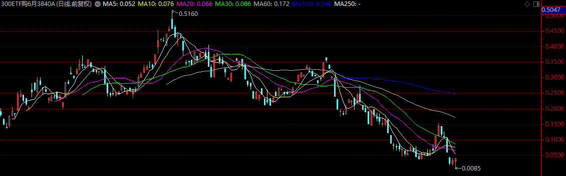 昨天又是大跌,300ETF收3.843元,6月3840A购体现末日效应了,以0.0229元收盘(实际内在价值接近0)。到明天期权到期,只要股价高于3.84元,那么这个正股+卖购就完成了备兑,一定能回收3.84元。如果股价低于3.84元,那么卖购部分就归0,正股可以重新启动新一轮领口理财策略。半年多来300指数表现如此差劲的确出乎意料。到期了居然还有评估业绩的悬念。