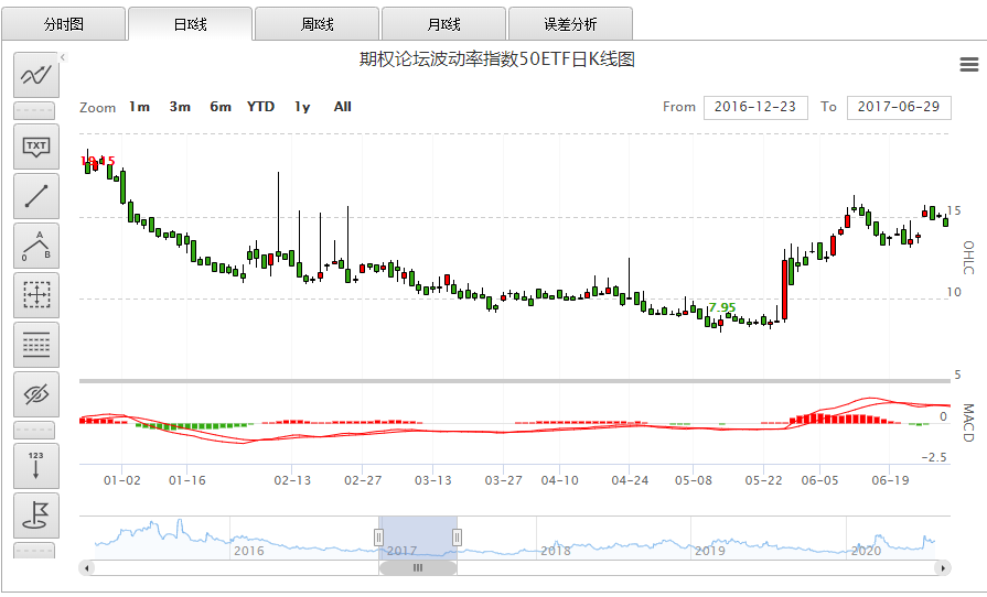 这是我自己保存的50ETF历史VIX图谱,时间段为2017年上半年。最低的VIX达到10%以下。