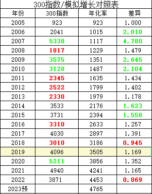 这次我修正了2022年的实际值,按照年化5%的300成分公司2022年实绩预估,得出2022年合理年化值4453点,同时预估2023年300公司正常年化增长率7%,得到预估值4765点!