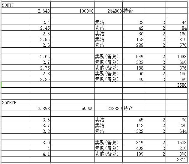 低于2.65买入50ETF10万份,分别在2.65、2.7、2.75、2.8、2.85备兑卖购各2张,同时卖沽2.6、2.55、2.5、2.45、2.4各2张,准备足够现金,如果行权即买入;300ETF也同理。